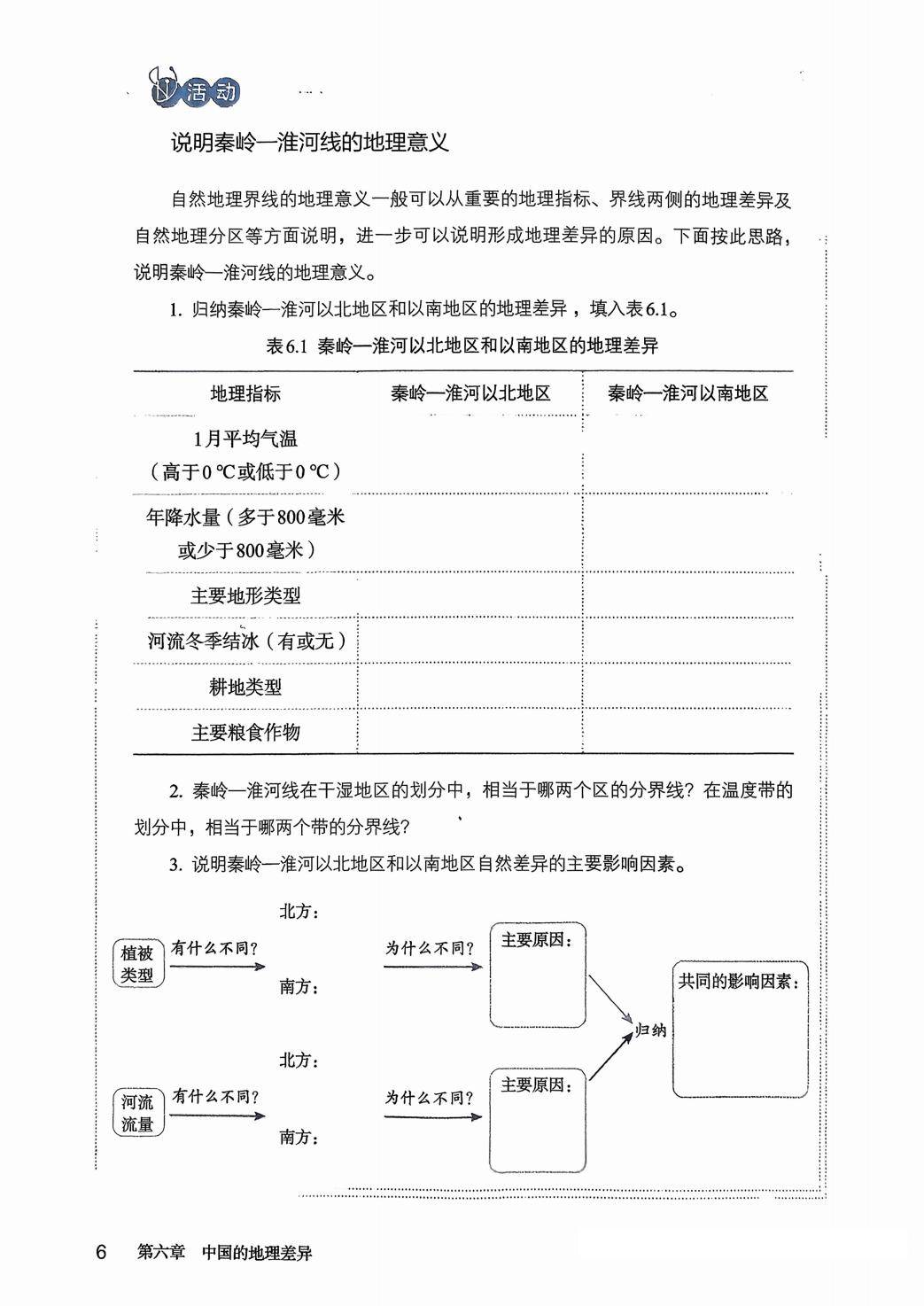 在学习活动方面,设置了思考探究题(如分析山脉成为自然地理界线的原因)、跨学科主题学习(如了解二十四节气的地理意义、设计节气名片),还有对不同区域生活文化特点的拓展思考,助力学生在探究中深化对地理知识的理解。