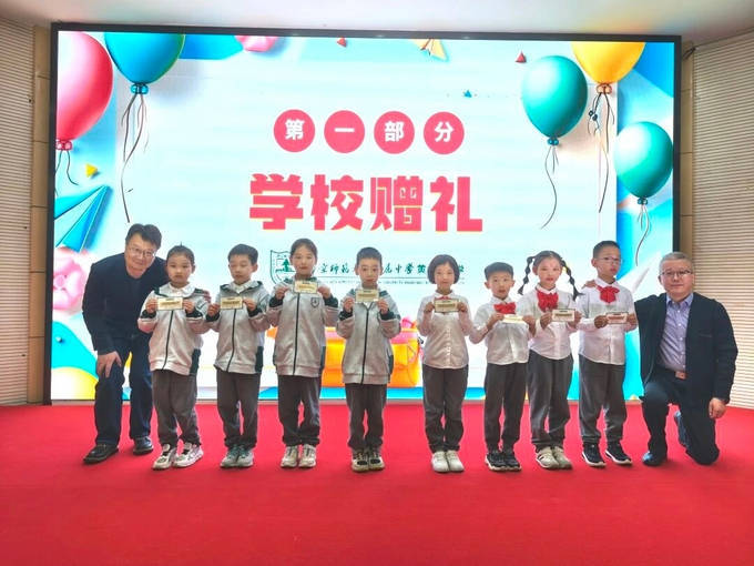 入学仪式正式开始啦!副校长丁维兵为全体一年级新生送上致辞。黄山路小学每个孩子都有一把刻有校训“少年英气,文武精进”的尺子,不仅是工具,更是陪伴成长的“人生标尺”。丁维兵说,期待孩子们“自生长,向未来”,握紧这把“人生标尺”,融入温暖的班集体,开启精彩的成长旅程!各班学生代表上台,从校领导手中接过一份份饱含心意的入学礼物——刻有“少年英气 文武精进”的定制书签。