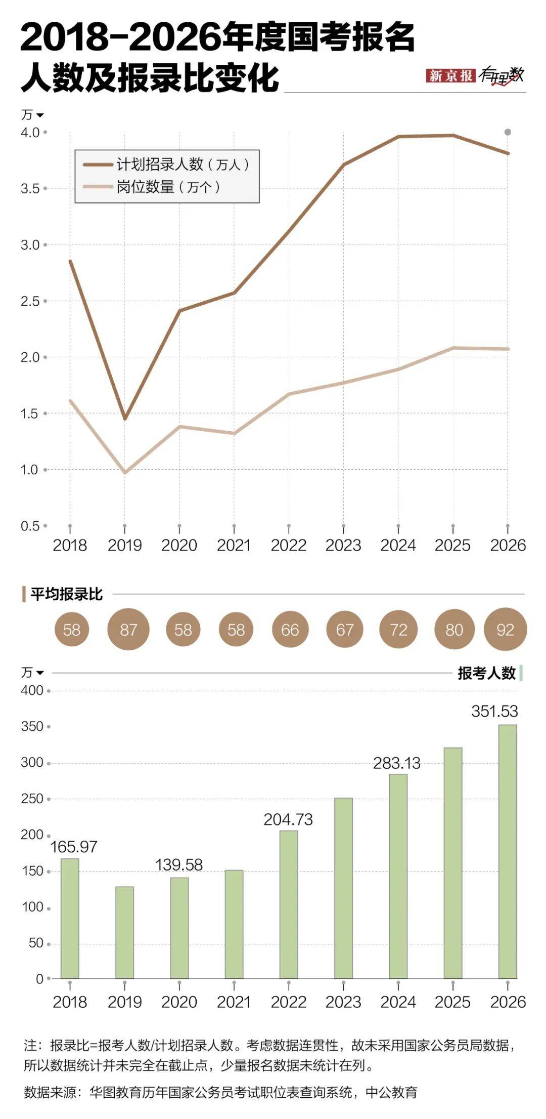 尤其是今年放宽了年龄限制,报名人数达到351.5万(这里为表现连年趋势,故采用第三方机构数据,该数据统计并未完全在截止点,少量报名数据未统计在列)。但另一方面,招聘岗位和人数却减少了。