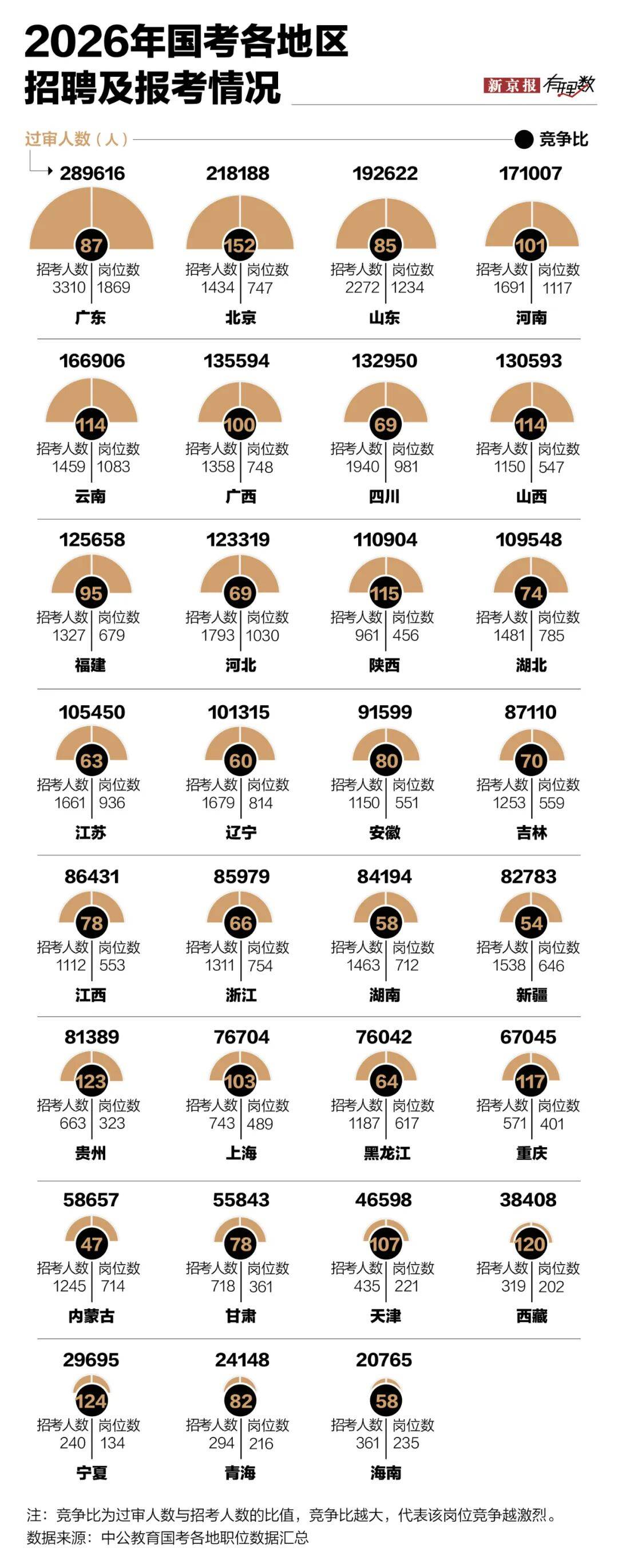 2026年度国考报名过审人数前三的地区是广东、北京和山东,竞争压力较小的四个地区分别是内蒙古、新疆、海南和湖南,其中黑龙江的竞争比为47:1,新疆54:1,海南和湖南分别为58:1。