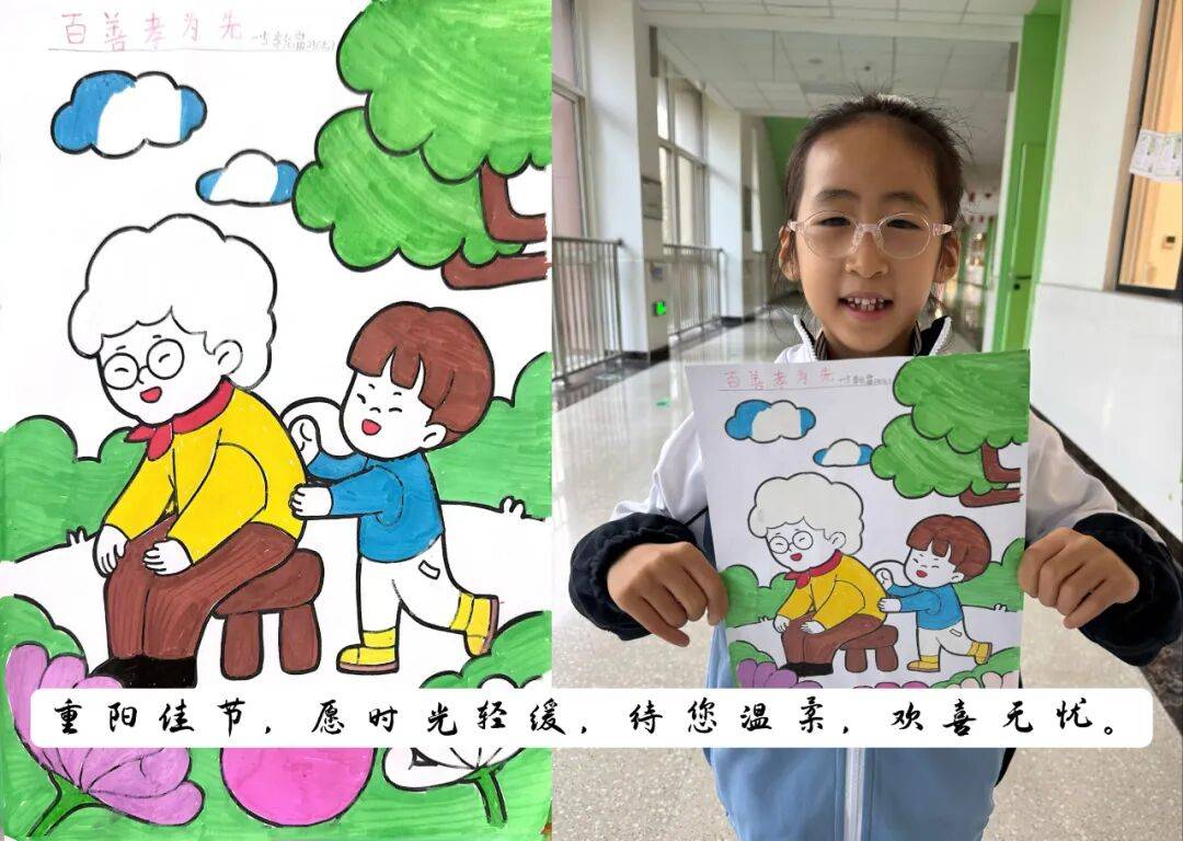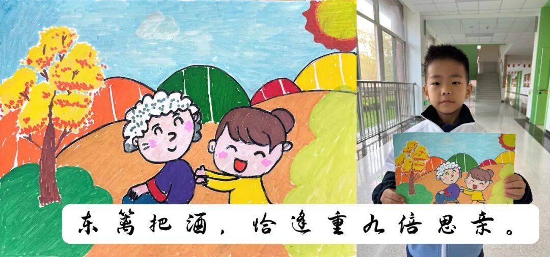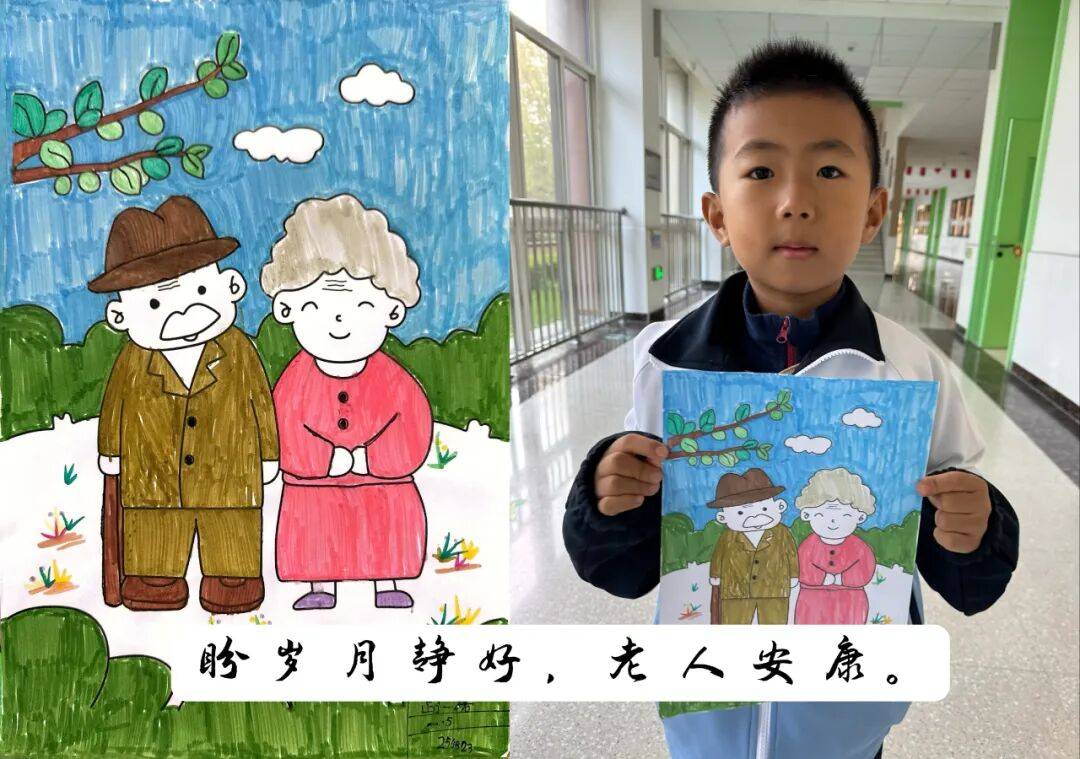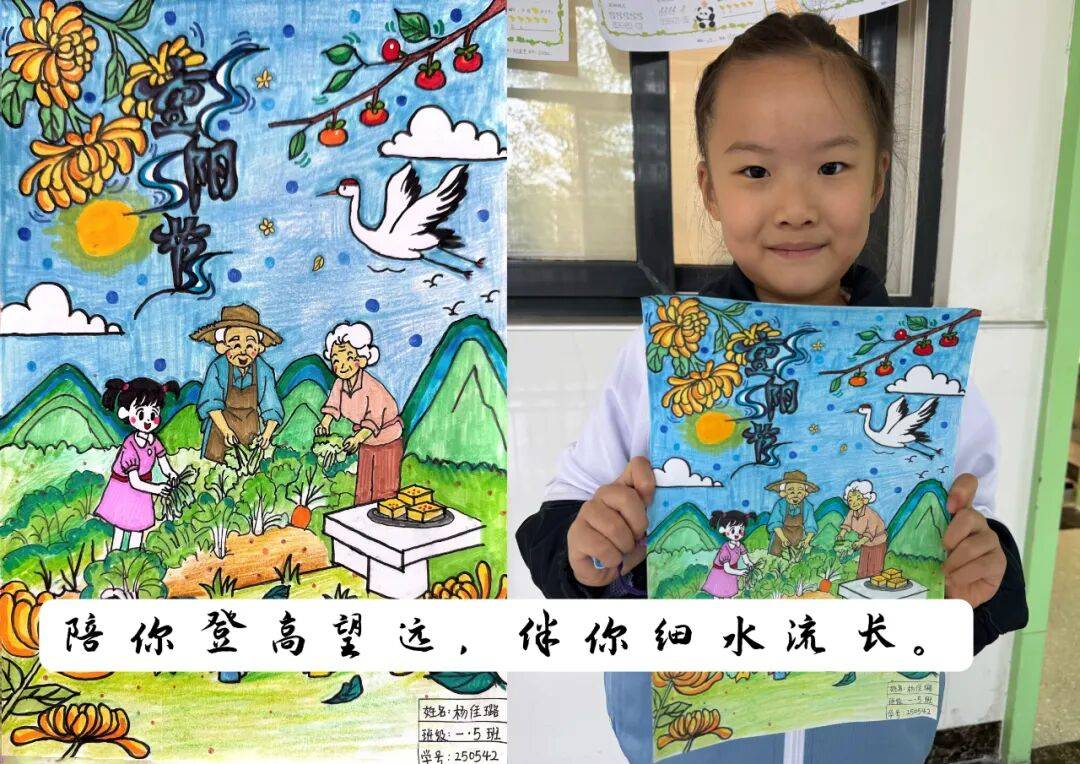 “我心中的重阳节”绘画活动中,一、二年级的小画家们化身“温情记录者”,用五彩画笔勾勒与长辈相伴的美好瞬间:有的画出和爷爷奶奶围坐桌前分享重阳糕的甜蜜,有的描绘陪外公外婆在公园赏菊的惬意,还有的定格帮长辈捶背、递茶的暖心画面。