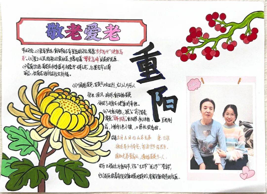 “重阳节起源于战国时期,登高、插茱萸都是传统习俗……”为深入了解节日文化,学校开展“重阳习俗手抄报”创作活动。学生以“重阳节的故事”为主题,化身“文化小研究员”:有的查阅资料梳理节日起源与发展,用清晰的文字呈现;有的发挥绘画特长,将“登高望远”“遍插茱萸”的场景绘于纸上;还有的设计趣味小知识板块,分享重阳糕、菊花酒的寓意。完成后,手抄报在班级文化墙集中展示,成为教室里一道独特的“重阳文化风景线”。