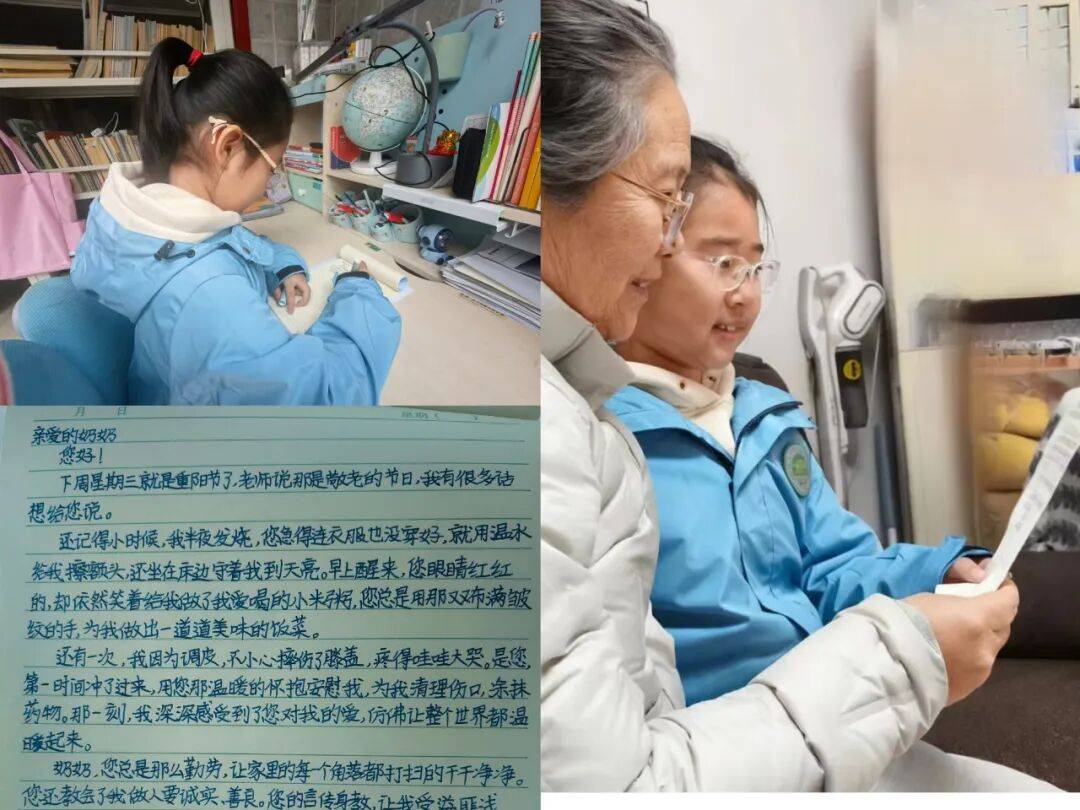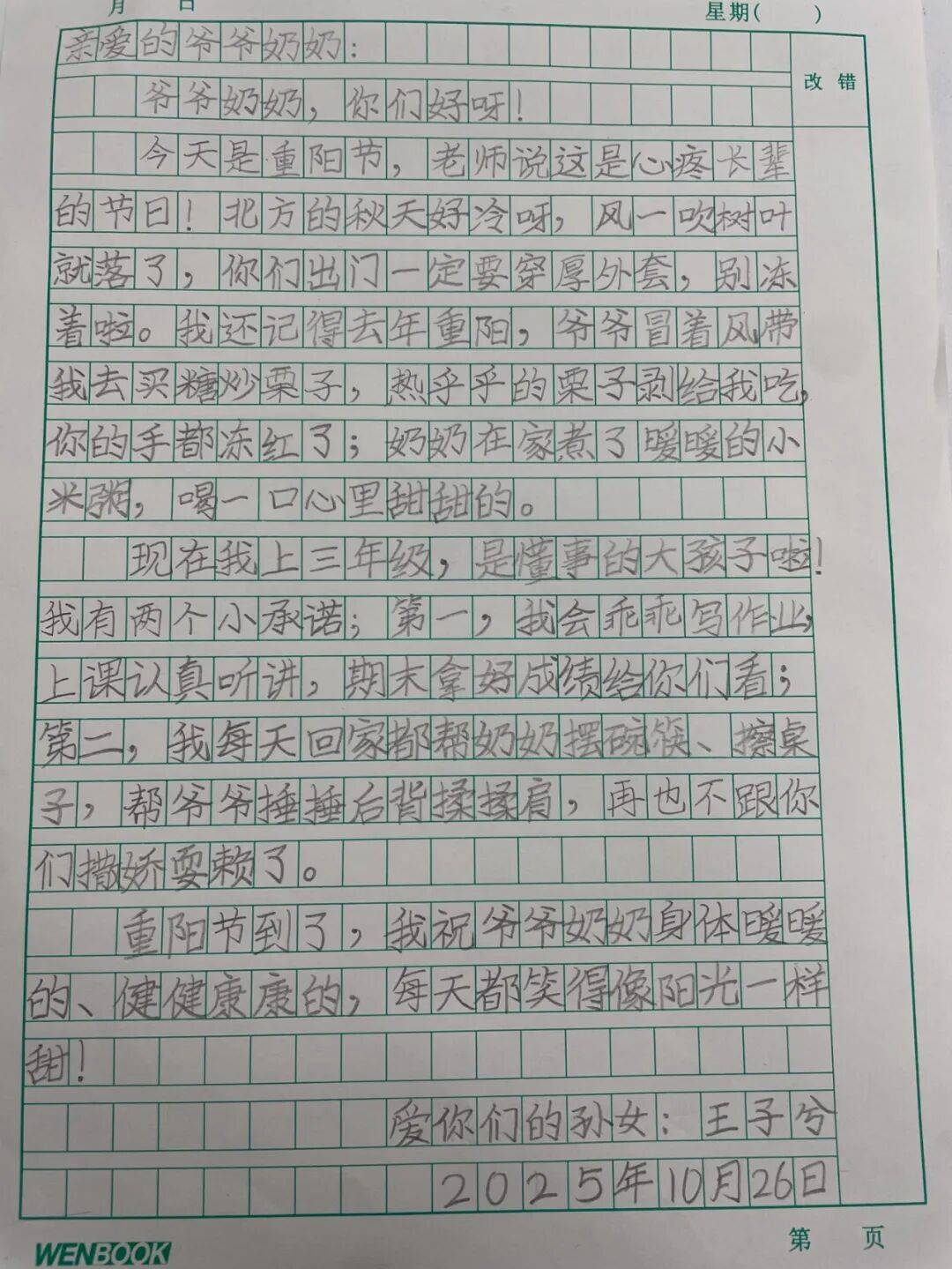 在“重阳感恩书信”征文活动中,三、四年级学生化身“温情写手”,将对长辈的思念与感恩诉诸笔端。他们回忆长辈照顾自己的细碎温暖——雨天里倾斜的伞、深夜里热好的牛奶、失败时鼓励的话;也写下对长辈的真挚祝福与成长承诺——“以后换我帮您捶背”“我会好好学习,不让您操心”。稚嫩的字迹里满是诚意,平实的话语中饱含深情。
