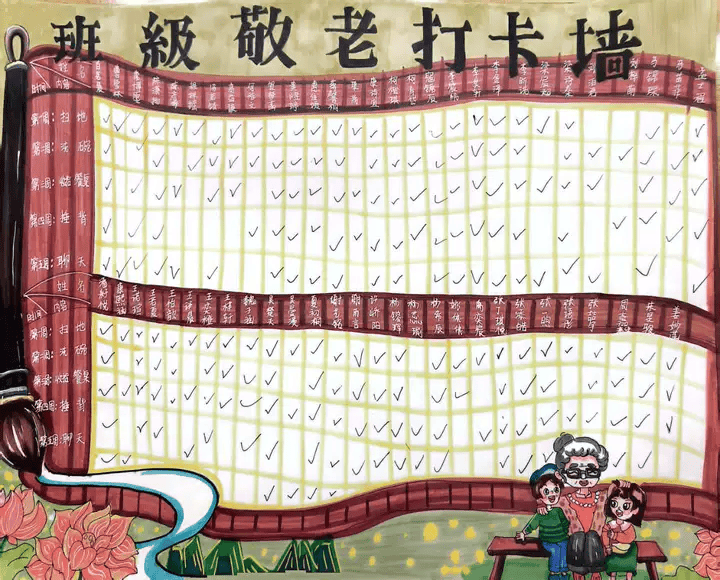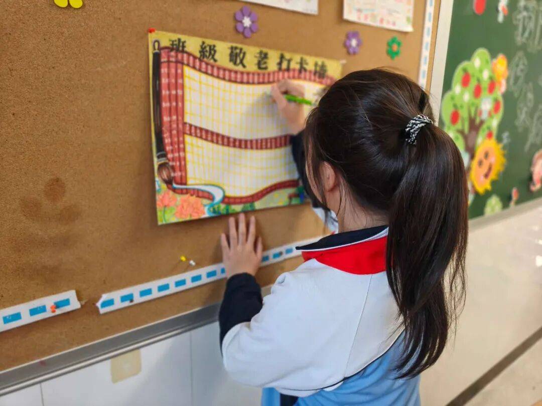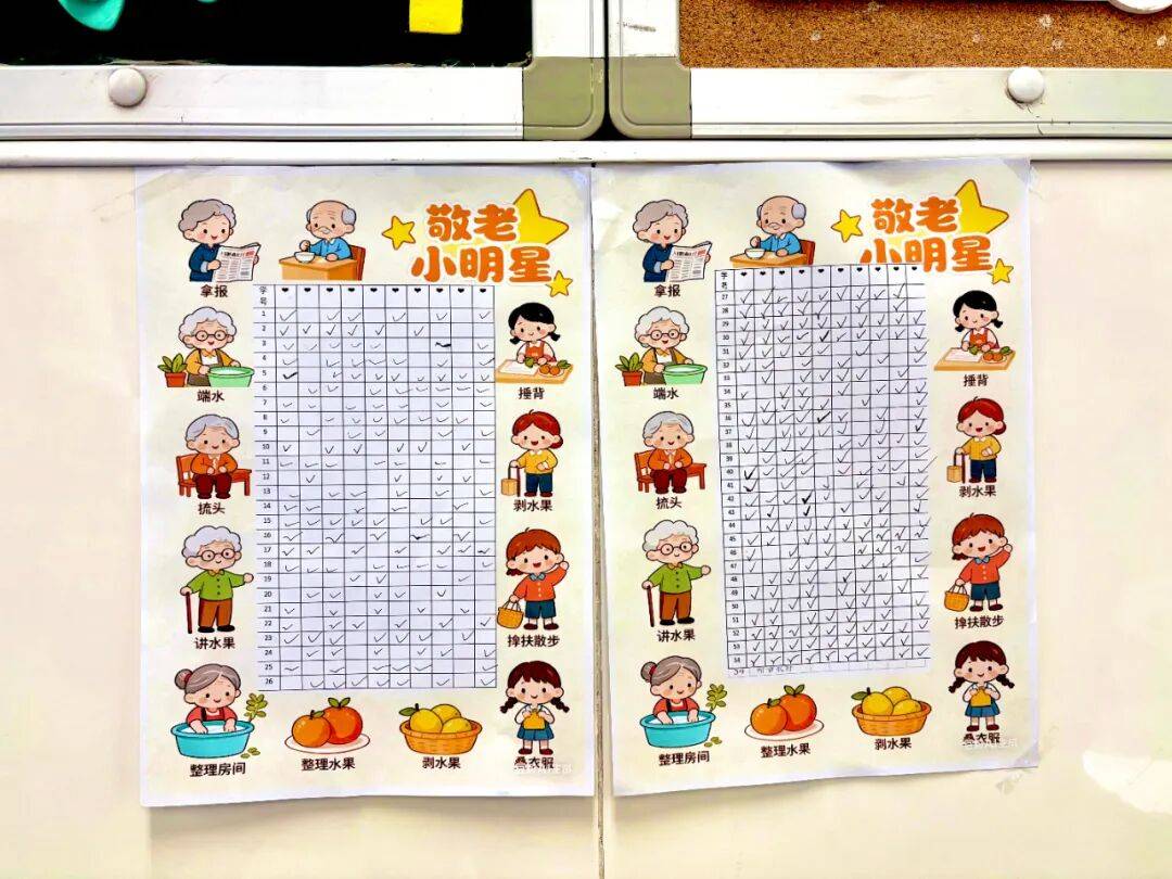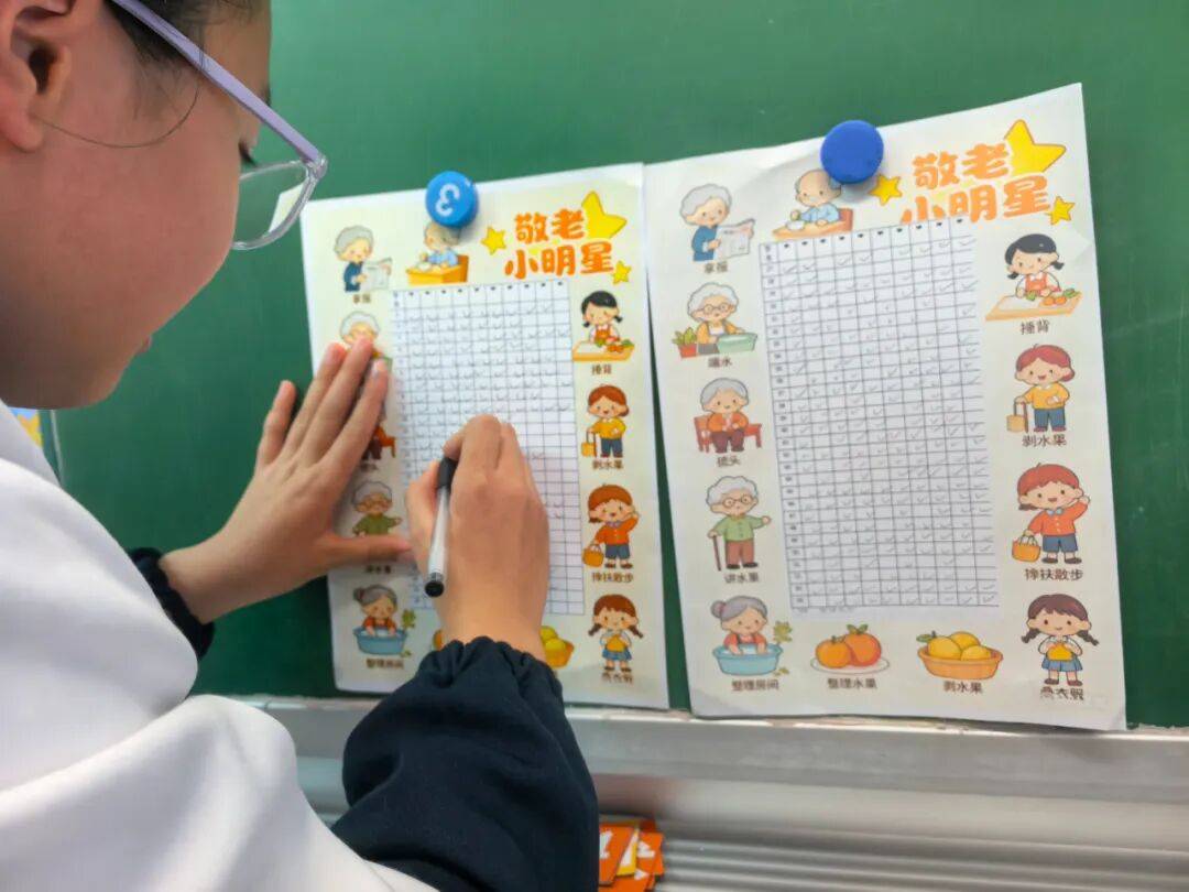 教室后方的“敬老打卡墙”,成为高段班级里一道独特的风景。“帮爷爷拿报纸”“给奶奶端杯温水”“陪外公读报纸”……一件件看似微小的敬老小事,被学生认真记录在打卡表上,每一个勾痕都是一份心意的注脚。“每周看看谁的勾最多,评‘敬老小明星’!”小小的打卡机制,激发了学生持续践行敬老行动的热情,让“敬老”从一时之举,变成日常习惯里的自然流露。