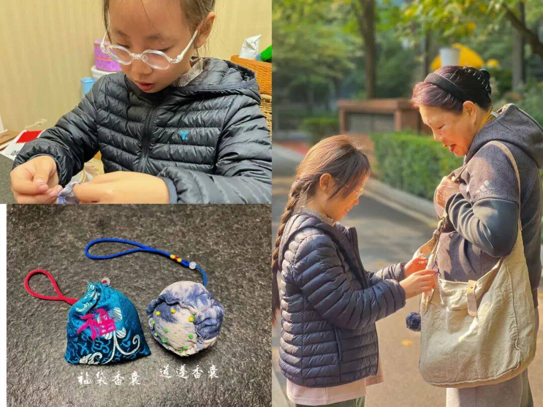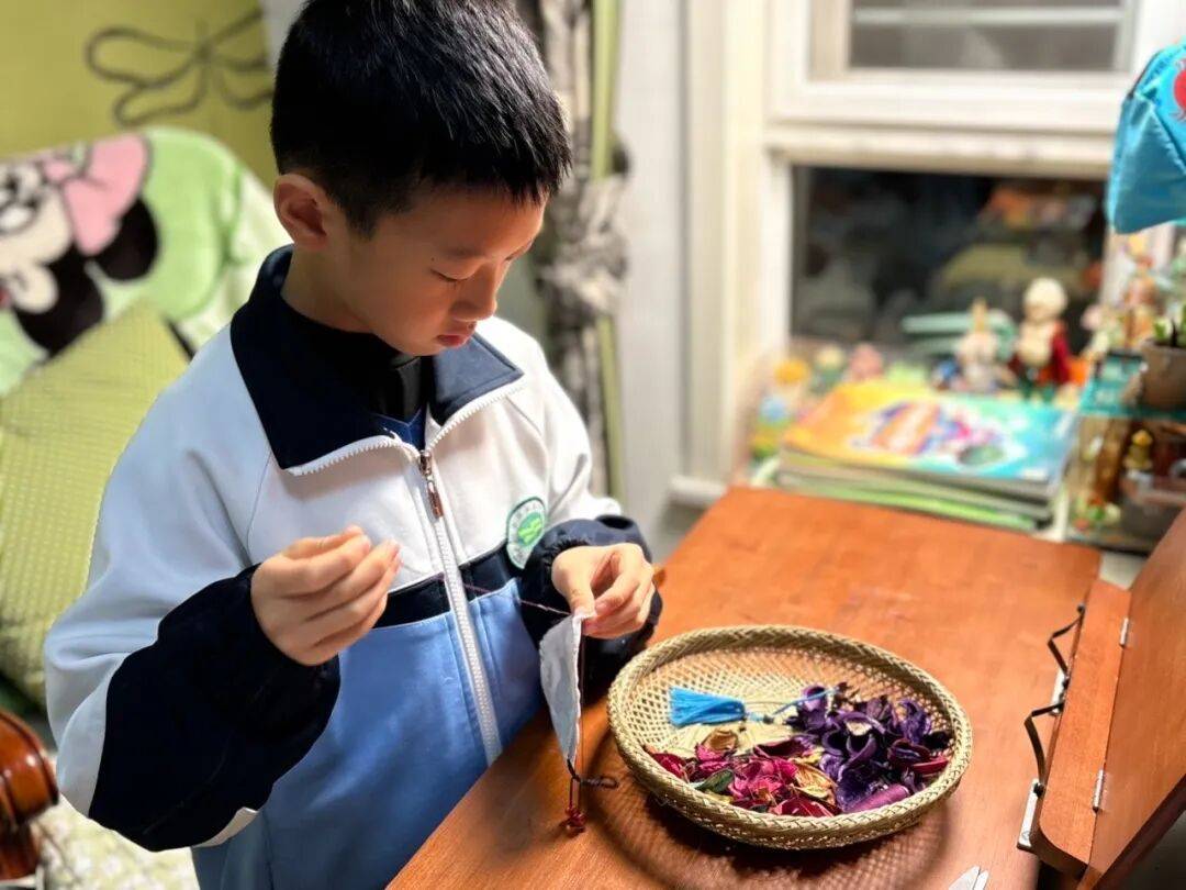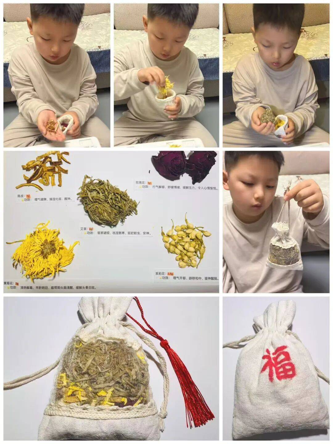 “茱萸能驱邪避灾,艾草能驱虫安神,这是老祖宗留下的智慧!”课堂上,老师细致讲解艾草、茱萸的药用价值与文化寓意,拉开了“茱萸香囊缝制”活动的序幕。学生手握彩线与布料,在老师的指导下穿针引线:先将布料对折缝出袋形,再小心翼翼装入干燥的艾草与茱萸,最后用彩线锁边,还不忘在香囊正面绣上简洁的“福”“寿”字样。指尖虽偶有笨拙,却格外认真;针脚虽不似专业工整,却满是心意。