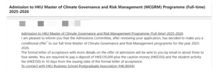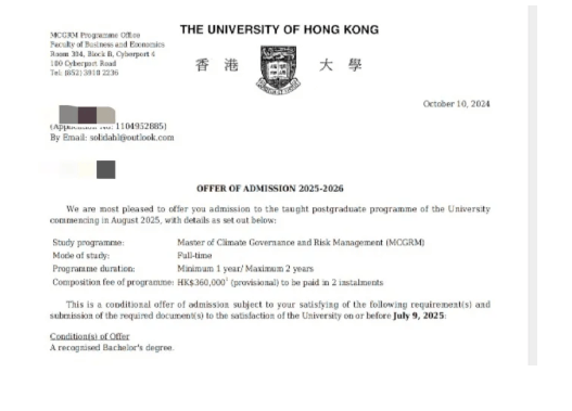 递交后我又开始焦虑:材料是不是还不够完美?提前批被拒会不会影响正式批?这种忐忑持续了没几天,某个下午查邮件时,突然看到港大的录取通知 —— 我反复确认了好几遍邮箱和专业名称,才敢相信 “真的录我了”!那种兴奋感难以形容,像是长久以来的努力突然有了回响。