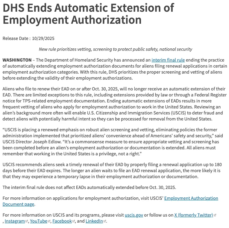 美国国土安全部(DHS)宣布,自2025年10月30日起,停止多数类别的EAD(就业授权文件)自动延长制度。今后,外籍申请人必须在新工卡获批后才能合法工作,这一政策立即影响到高校中的大量外籍教师、研究助理及OPT阶段的留学生。此前的“自动延长”制度,是许多国际职工避免就业空档的最后保障,如今被终止后,可能出现数周甚至数月的“身份与薪资真空期”。教育界批评称,这一新规在强调“安全审查”的同时,也让高校人事与科研项目陷入管理混乱,部分正在续签的外籍科研人员或被迫中断实验工作。