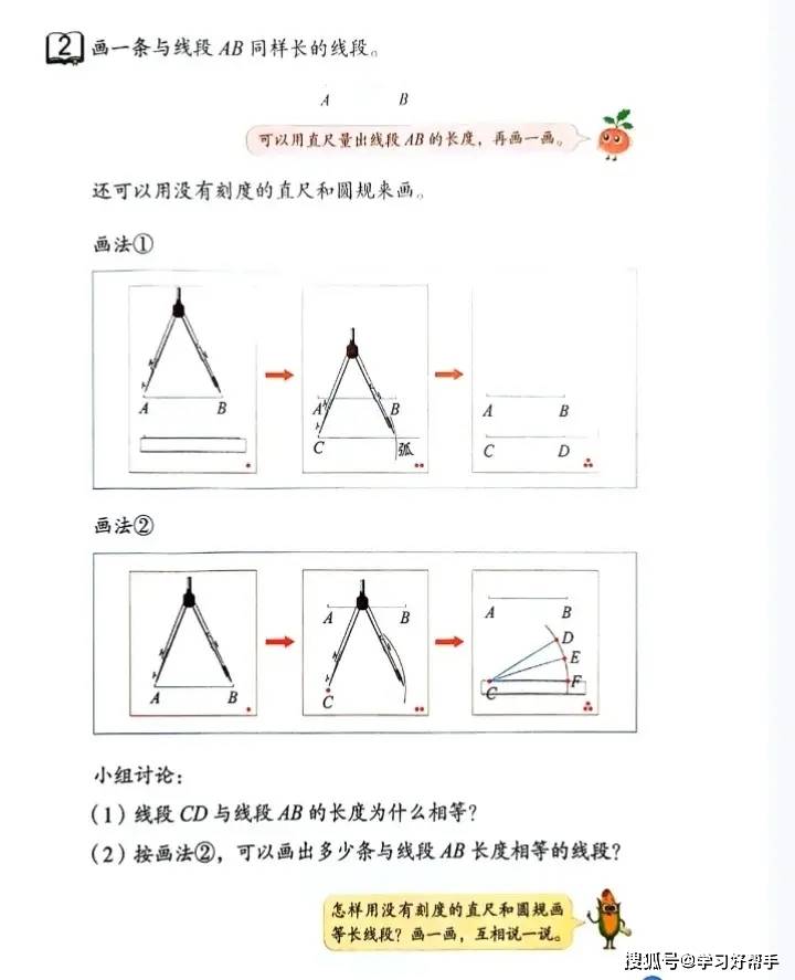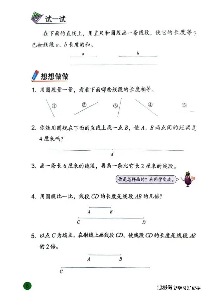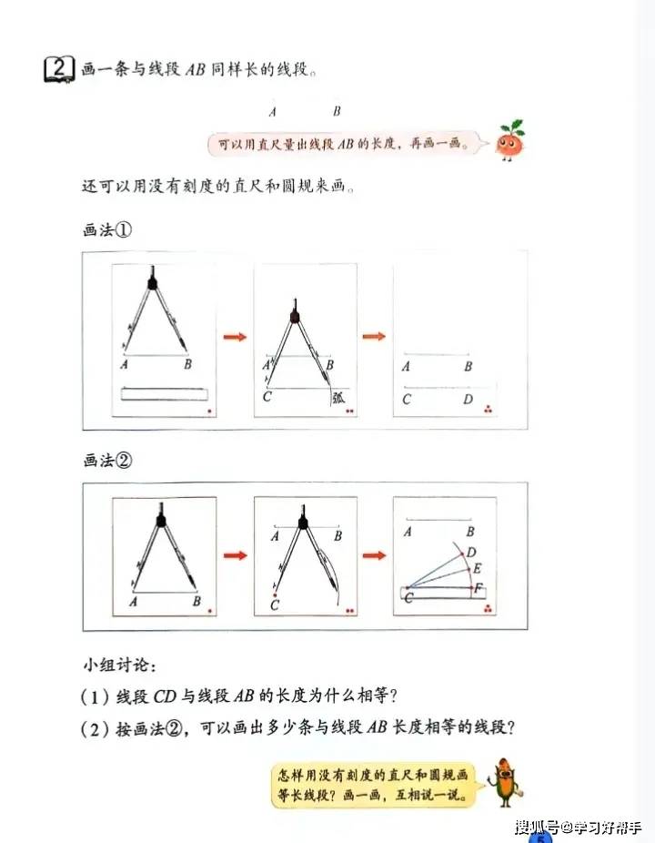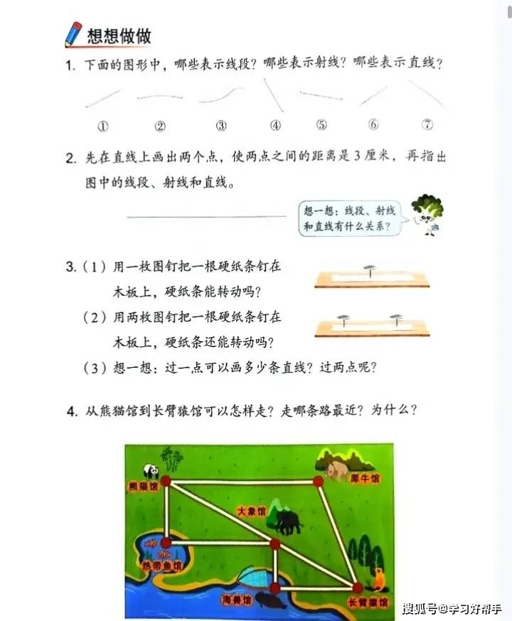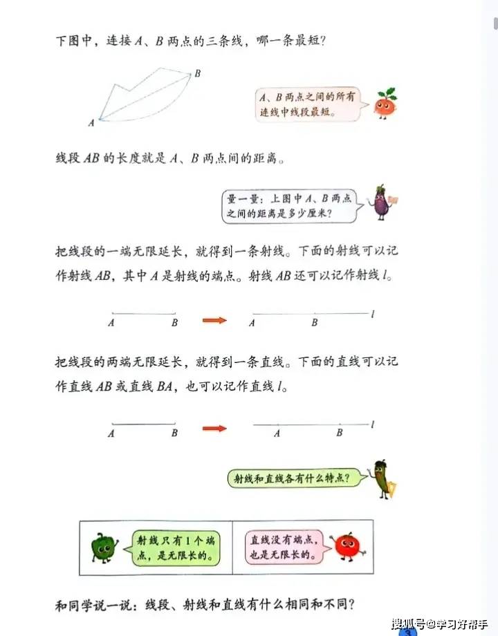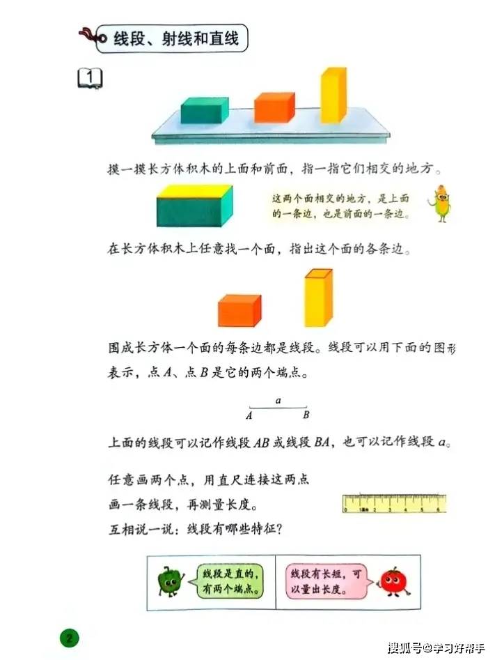 在学习体验与能力培养上,教材 “图文结合 + 动手操作” 超给力:知识点讲解采用 “卡通对话 + 图形对比” 的形式,比如区分 “线段、射线、直线” 时,用卡通人物对话提问 “它们都有端点吗?能无限延伸吗?”,搭配不同颜色的图形标注关键特征,一看就懂;例题设计也充满生活趣味,像 “垃圾分类中的数学问题”(统计不同垃圾的数量)、“超市购物中的计算问题”(两位数乘两位数的实际应用),让学生感受到数学与生活的紧密联系,激发学习兴趣。同时,教材特别注重动手操作环节,比如 “画等长线段的两种方法”(用直尺画、用绳子量后画)、“用小正方形拼长方形探索面积公式”,引导学生在动手实践中理解知识原理,既培养实践能力,又锻炼逻辑思维,让数学学习从 “被动接受” 变成 “主动探索”。