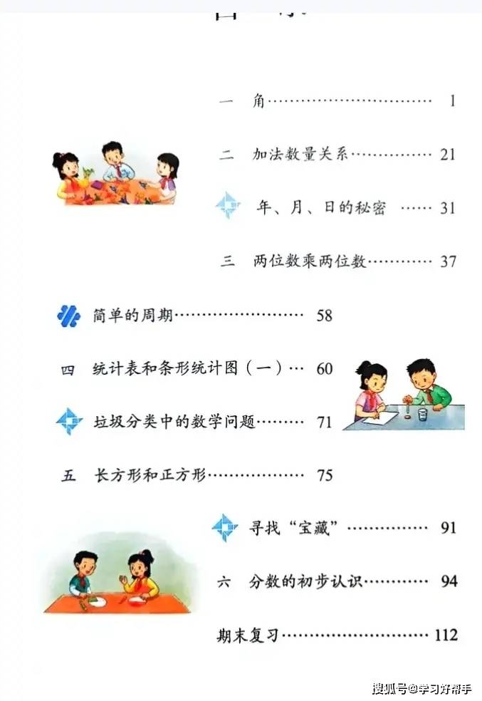 在单元编排上,教材 “由浅入深” 符认知,学习更顺畅:严格遵循三年级学生的认知规律,单元设置层层递进 —— 先从 “角的认识”“加法数量关系” 等基础概念入手,打好数学思维的 “地基”;再过渡到 “两位数乘两位数”“长方形和正方形” 等运算与几何知识,逐步提升计算能力与空间观念;最后以 “分数初步认识”“统计表和条形统计图” 收尾,开启抽象思维与数据分析能力的启蒙。每个单元内部也注重梯度设计,比如 “分数初步认识” 先从 “一个物体的几分之一” 学起,再到 “一个整体的几分之一”,循序渐进,让学生在学习中不断建立信心,避免 “知识点跨度大、跟不上节奏” 的问题。