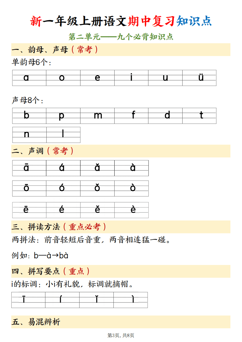 这份资料是新一年级上册语文期中复习知识点,涵盖多个单元,包含易错字音、会写字笔顺、重点笔画、形近字、近义词反义词、背诵积累、拼音(韵母、声母、声调、拼读方法、拼写要点)、会认字词等板块,全面覆盖一年级上册语文期中的拼音、汉字、词汇、背诵等核心知识点,且对重点必考内容进行了明确标注。