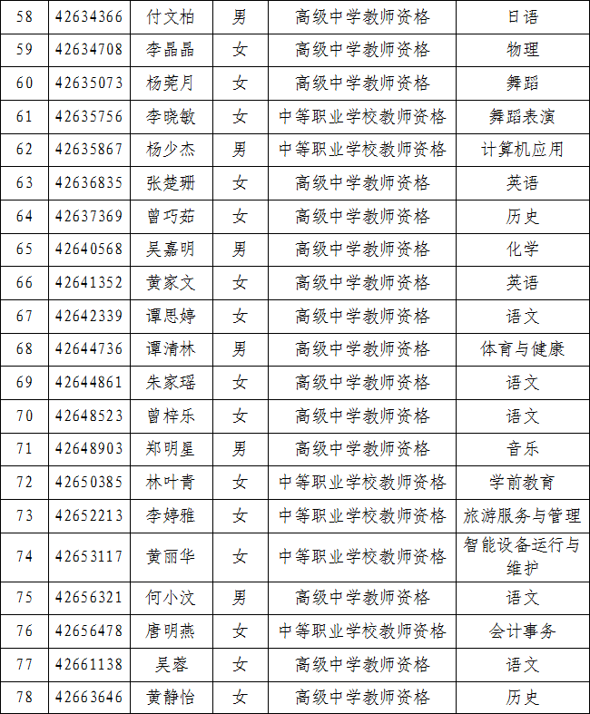 根据教育部《<教师资格条例>实施办法》和《广东省教育厅关于做好2025年下半年中小学教师资格认定和定期注册工作的通知》规定,经网上报名、现场确认、体检、无犯罪记录核查等程序,拟同意陈世豪等82位同志取得相应教师资格。现依照有关规定予以公示,在公示期内,如有异议,可通过来信、来电等方式,向清远市教育局反映公示对象的情况和问题。反映问题必须坚持实事求是的原则,不得借机诽谤和诬告。以个人名义反映的须实名,以单位名义反映的应加盖单位公章。