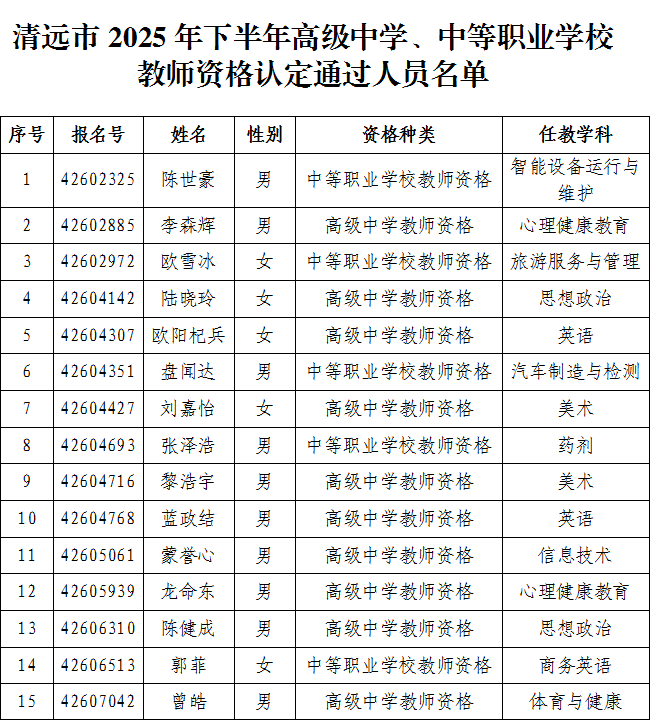 附件:清远市2025年下半年高级中学、中等职业学校教师资格认定通过人员名单