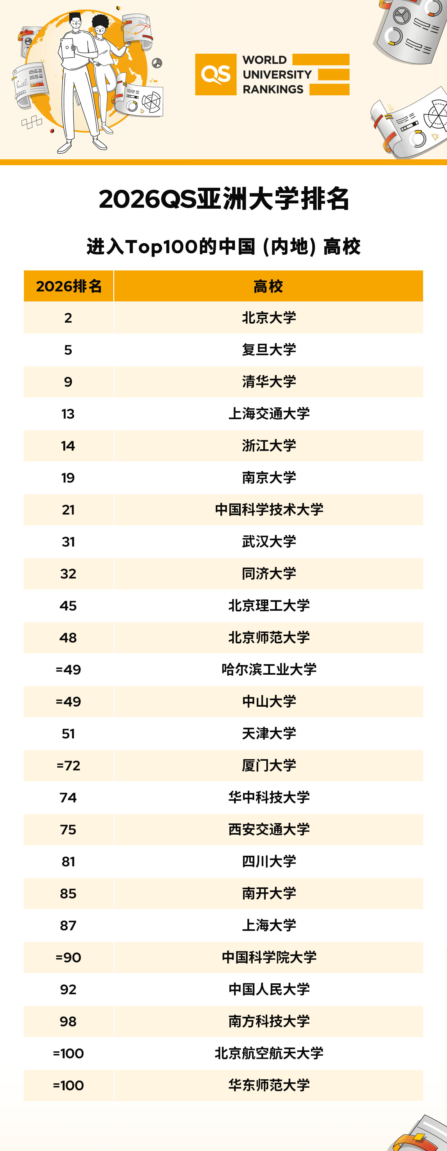 中国内地高校表现同样亮眼。北京大学位列第2,复旦大学保持第5位置,清华大学位列第9,上海交通大学和浙江大学分别位列第13和14位。