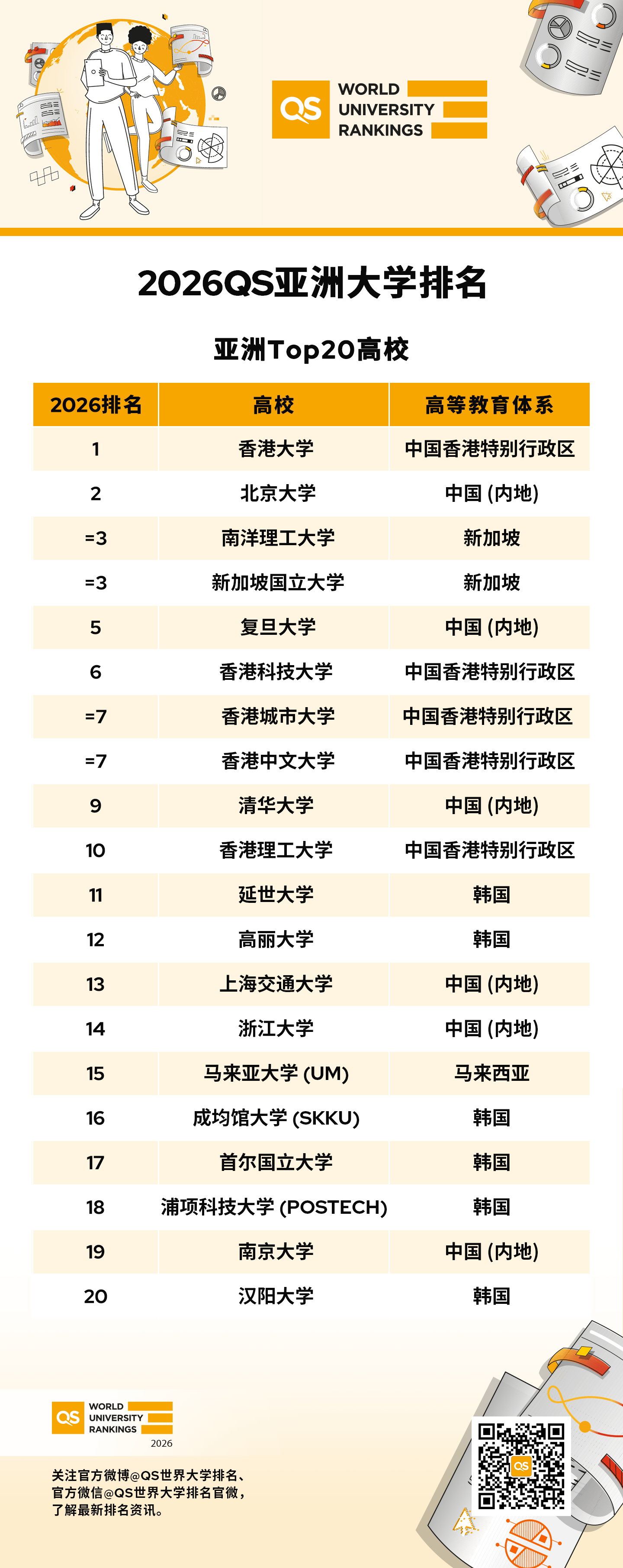国际高等教育研究机构QS(Quacquarelli Symonds)近日正式发布了2026年亚洲大学排名,这份备受全球学子关注的最新榜单瞬间引爆留学圈。