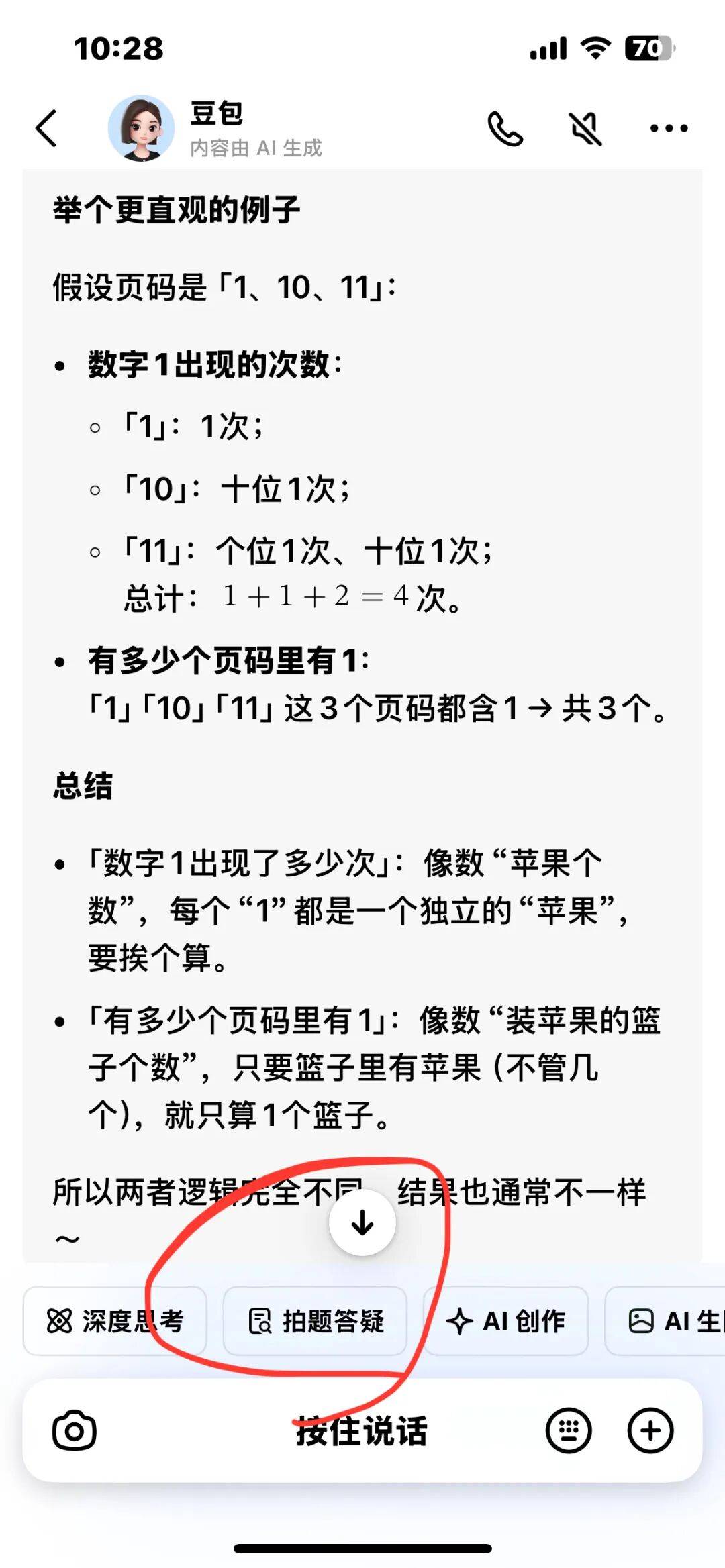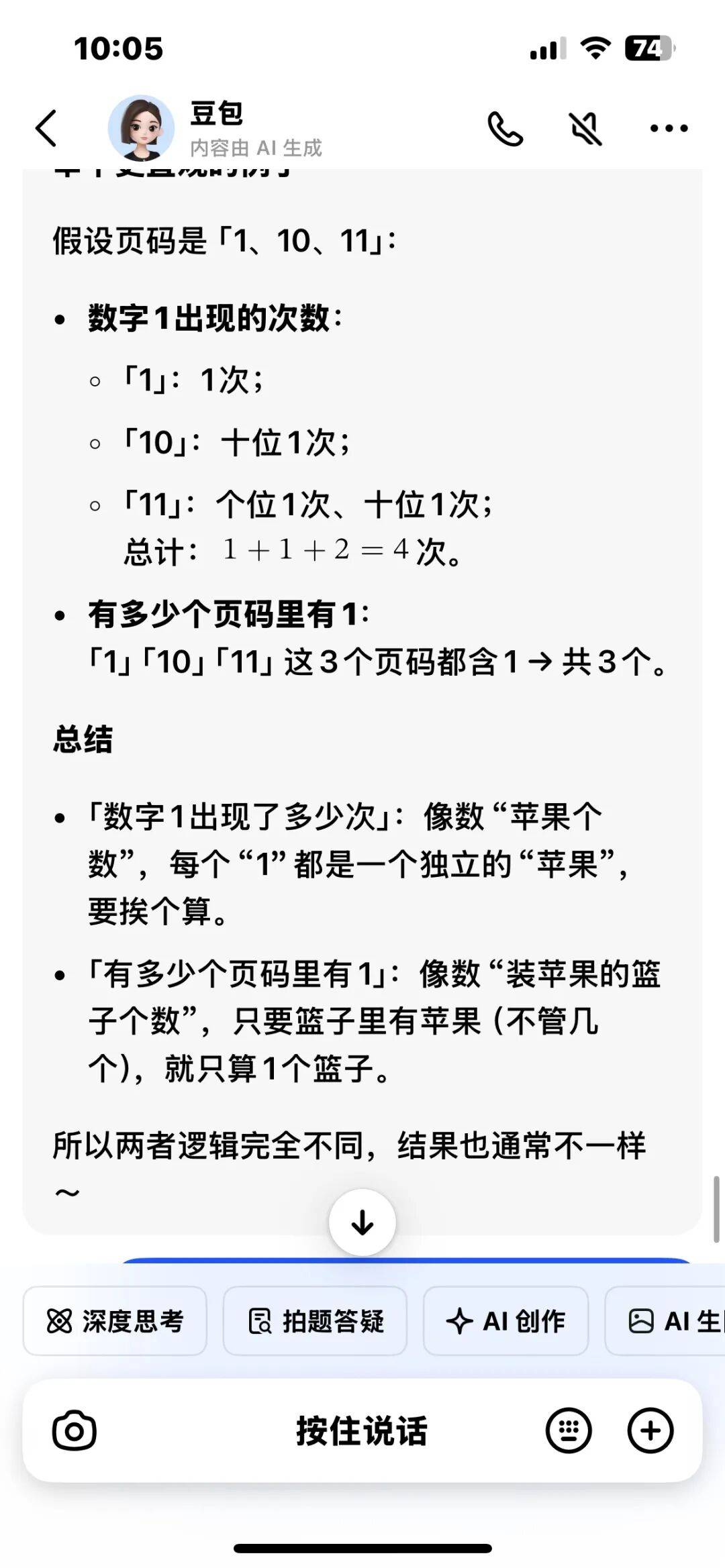 原题是对“数字出现次数”统计逻辑的疑问,核心是统计的是“数字1在页码中出现的总次数”,而非“有多少个页码包含数字1”,所以不需要减去重复。
