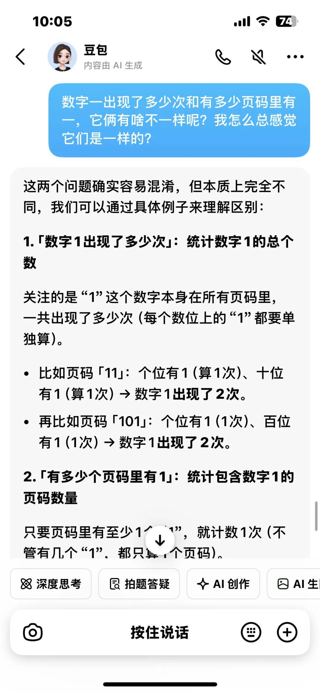 豆豆,这个题里面我有一个疑问,数字1在计算十位上的时候出现了一次,计算百位上的数字的时候,它是不是重复的?比如101,它在计算个位上的数字1的时候出现了一次,计算百位上的数字1时,它又出现了一次,这是不是算重复了?用不用减掉重复的这些?