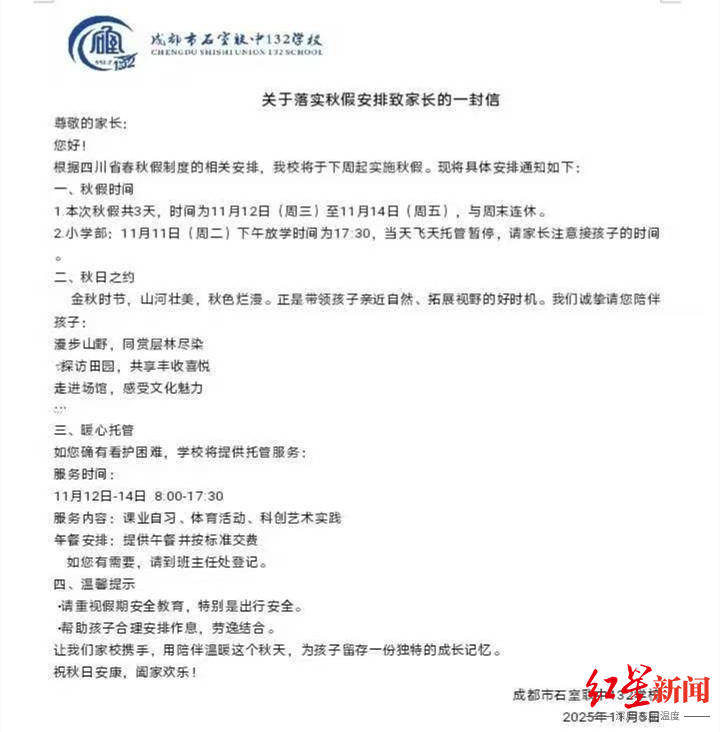 11月5日,成都市石室联中132学校(以下简称“132学校”)向家长发布了《关于落实秋假安排致家长的一封信》。
