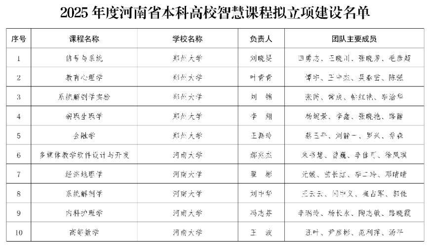 根据河南省教育厅办公室《关于2025年度河南省本科高校精品课程建设申报工作的通知》(教办高〔2025〕200号)要求,经个人申报、高校推荐、网络评审、会议评审,拟立项建设郑州大学《信号与系统》等300门2025年度河南省本科高校精品课程。