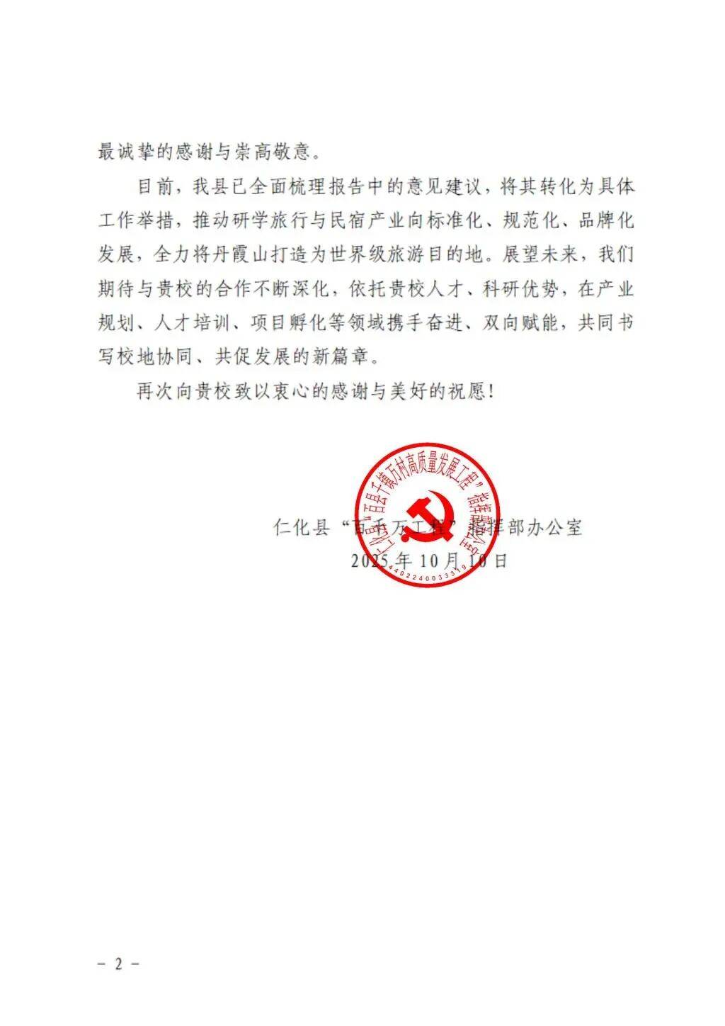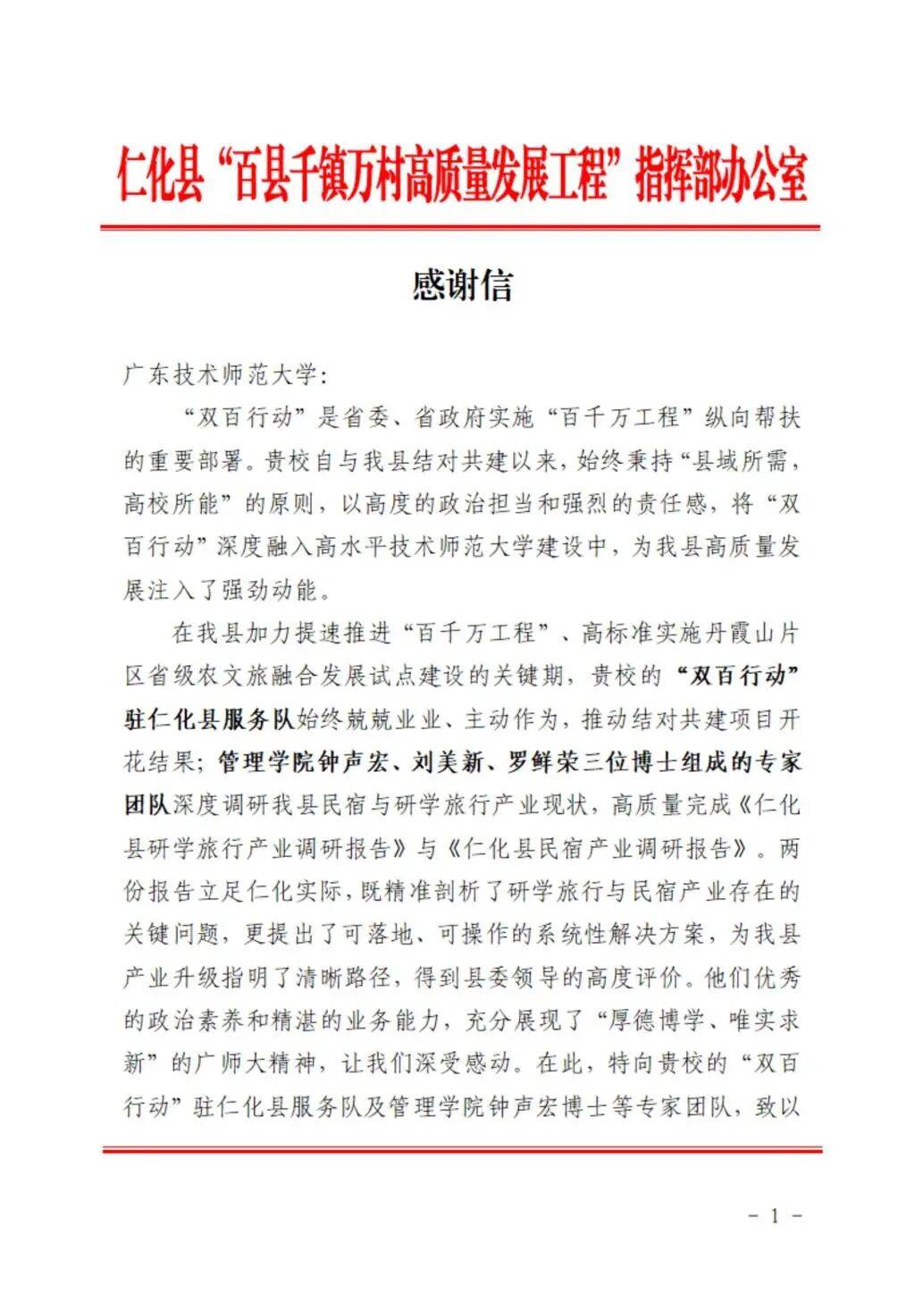 近日,仁化县“百千万工程”指挥部办公室向我校发来感谢信,对我校驻仁化县服务队和管理学院在“双百行动”中为仁化县研学旅行与民宿产业高质量发展作出的重要贡献予以高度肯定和诚挚感谢。