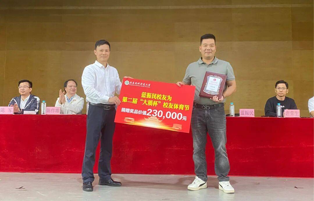 在随后的捐赠仪式上,校友们向母校表达了深情厚谊,其中:潮州校友联络处主任、1998届管理学院校友蓝振民捐赠价值23万元的“大质”凤凰单丛茶一批,2009届外语学院校友许美玲捐赠价值1.8万元的“贝琳达”不锈钢锅具一批,2013届管理学院校友蓝海龙捐赠价值1.3万元的筋膜枪一批,作为本届校友体育节的赛事奖品;2006届美术学院校友劳宏艺和校友乒乓球俱乐部分别向体育专项基金捐赠1万元,校友羽毛球俱乐部向体育专项基金捐赠6000元。