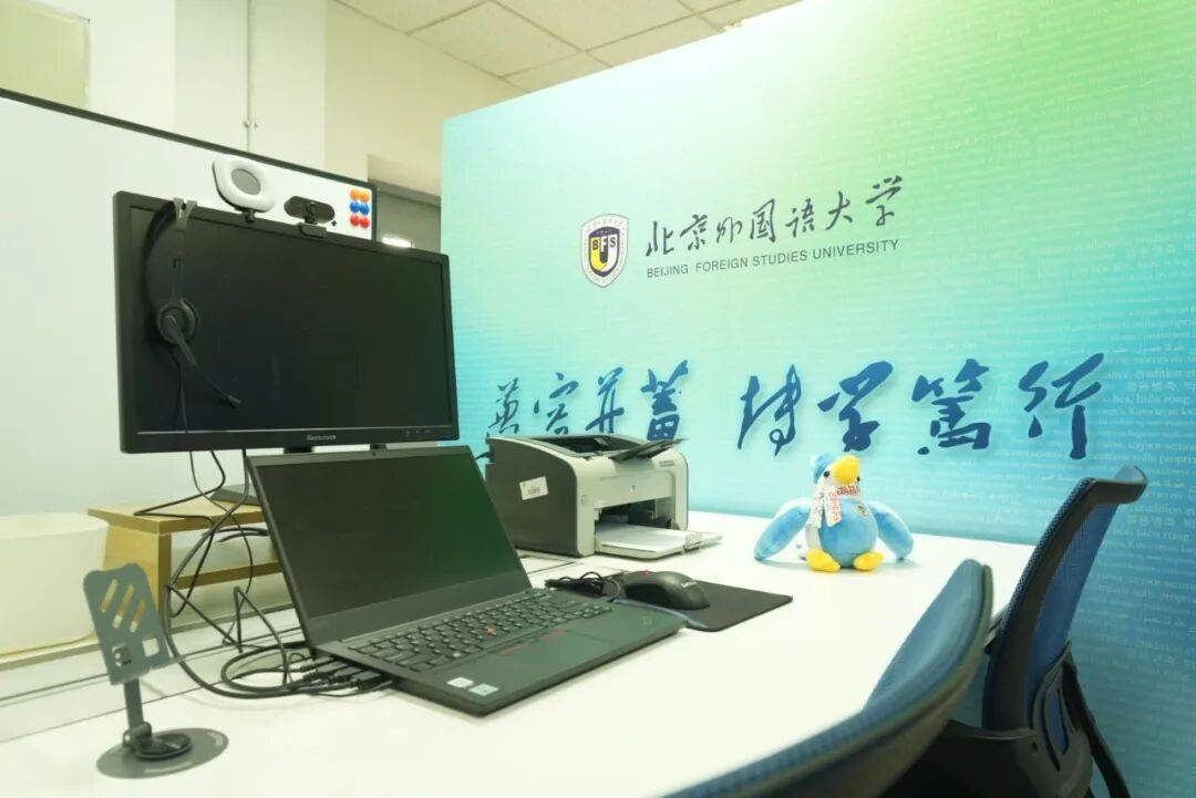 1、配备标准笔记本电脑、拓展屏幕、耳机、麦克风、打印机和补光灯等设备及北外特色背景;