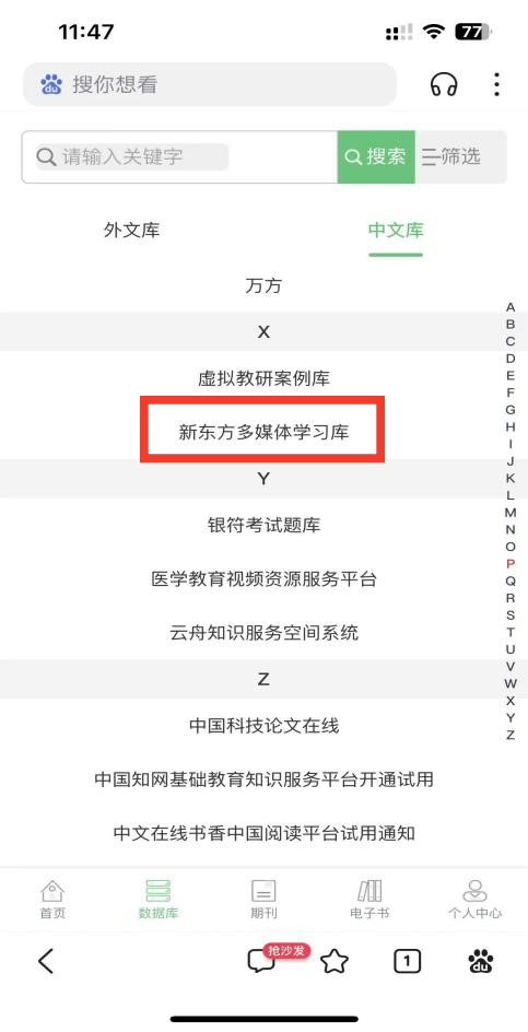 三、在中文库列表中点击“新东方多媒体学习库”,进入数据库主页,在首页【最近直播】栏目进入直播间观看。