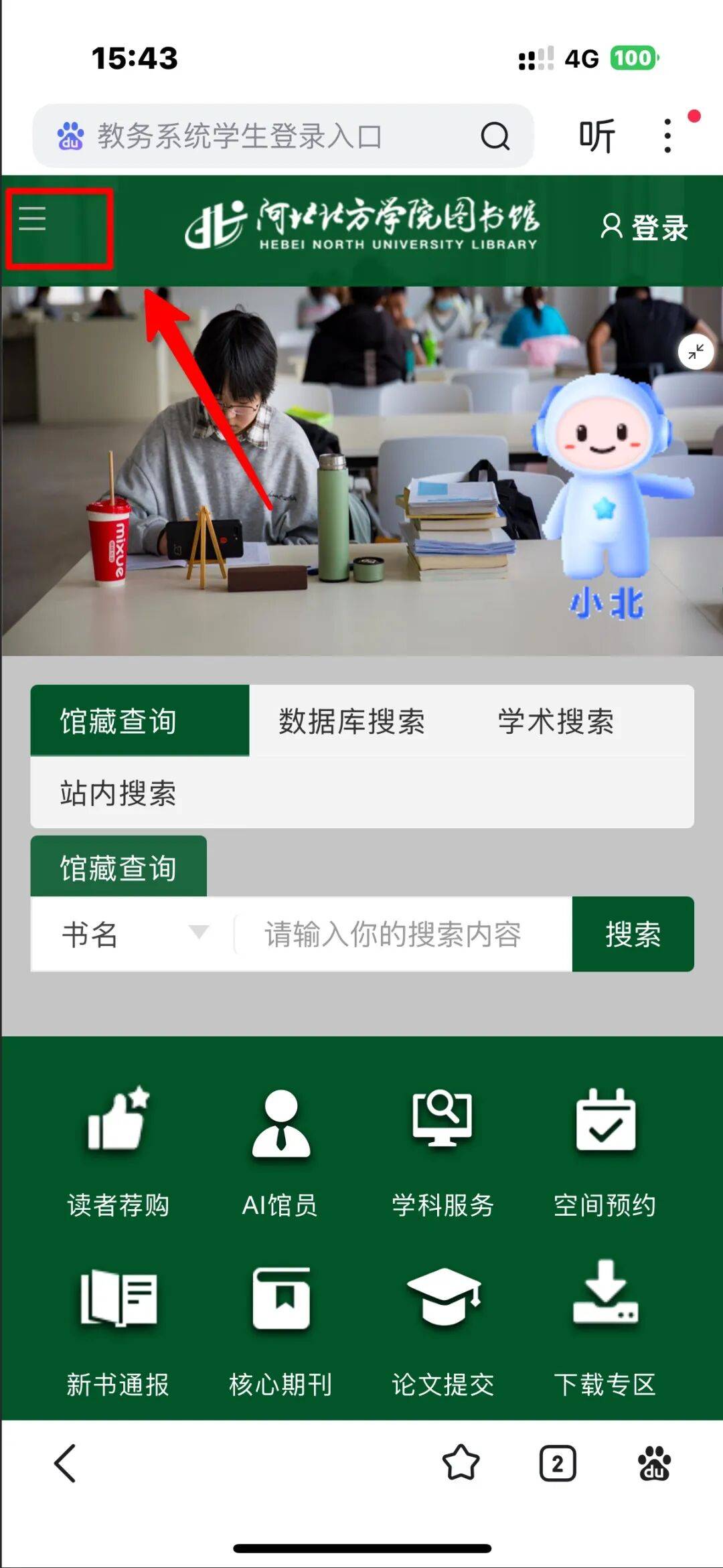 一、手机端打开“河北北方学院图书馆”主页,标,再点击“校外访问”,进行登录。