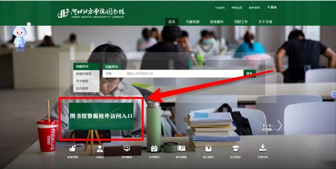 一、打开“河北北方学院图书馆”主页,点击“图书馆资源校外访问入口”,进行登录。