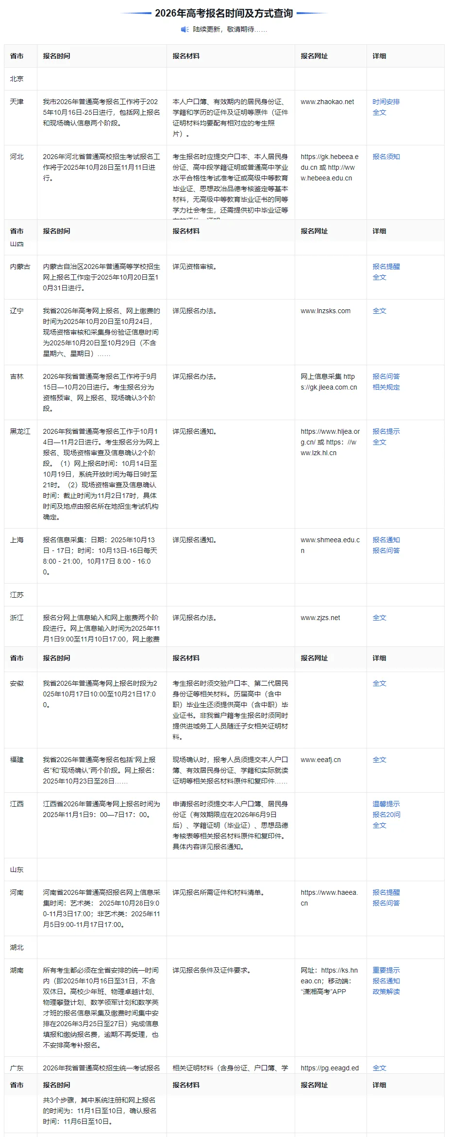 目前,多数省份已公布了2026年高考报名时间,高考报名工作集中在10月至11月进行。请考生根据省级招办的统一安排,在指定时间、地点报名。报考艺术类、体育类的考生要注意,是否要在同一时间进行统考报名、缴费,各种类型之间是否可以兼报,具体填报要求等。