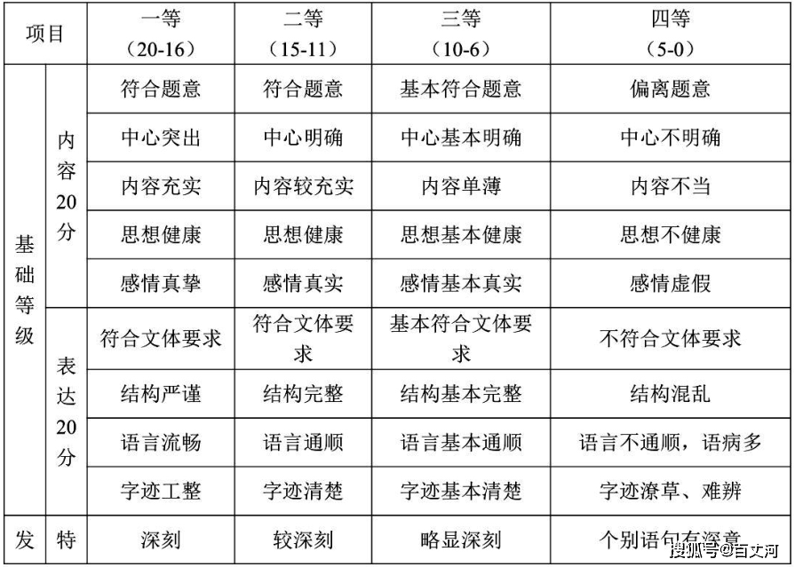 ①内容项三等的作文,表达项判分无限定,不过在实际操作中基本上顶多相邻项给分,不可跨类给分。内容四等的表达项不超过二等中。