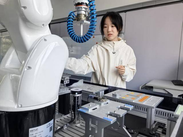 平时,他们一周上五天课程,包括电力、机械以及软件编程等课程。记者在教室里看到,有一个机械臂的装置。她们会学习编程,控制机械臂进行各种细微操作。同时,还有一个巨大的线路墙,用来实际进行操控。这些机械臂,如今在工厂里实际应用非常广泛。
