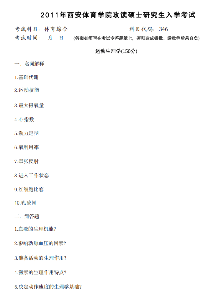 2025年西安体育学院346体育综合考研真题试卷与参考答案