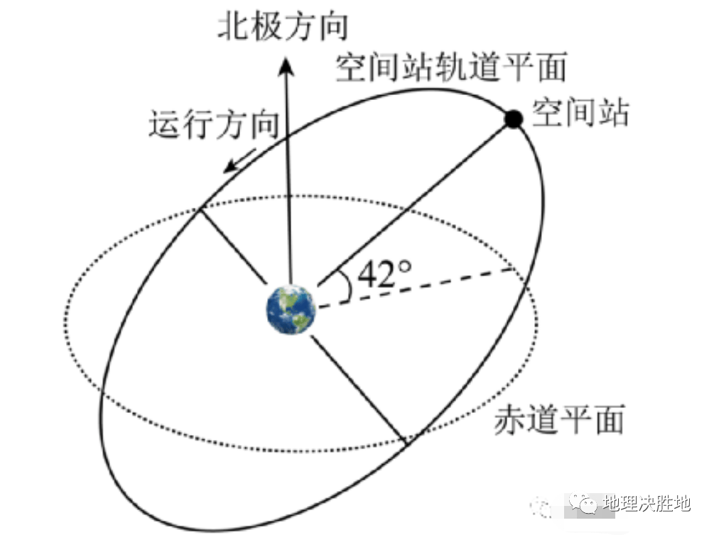 中国空间站在距离地表约400千米的接近北极方向的正圆轨道上运行,绕地球一圈约90分钟。空间站轨道平面与赤道平面的夹角约42°(如图所示)。据此完成下面小题。