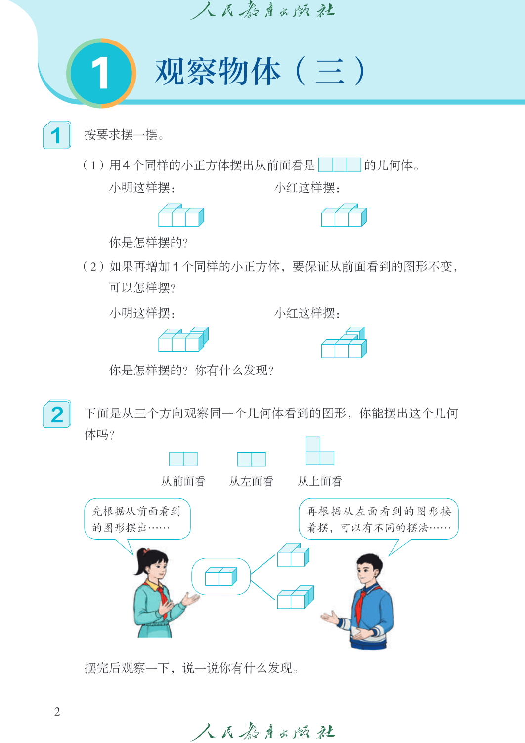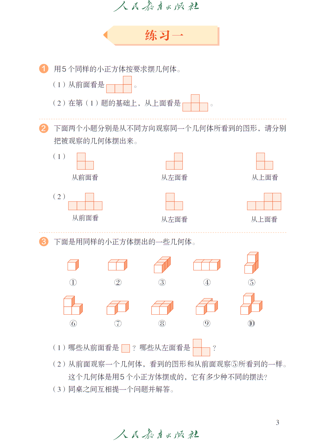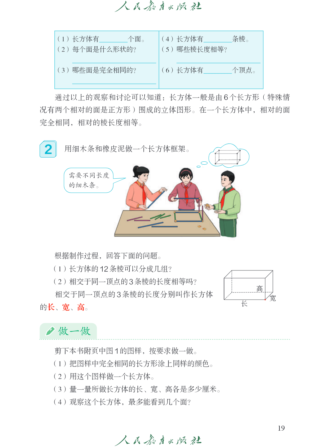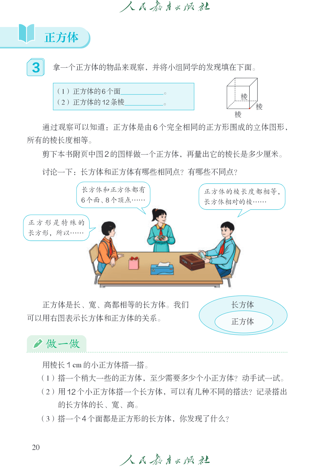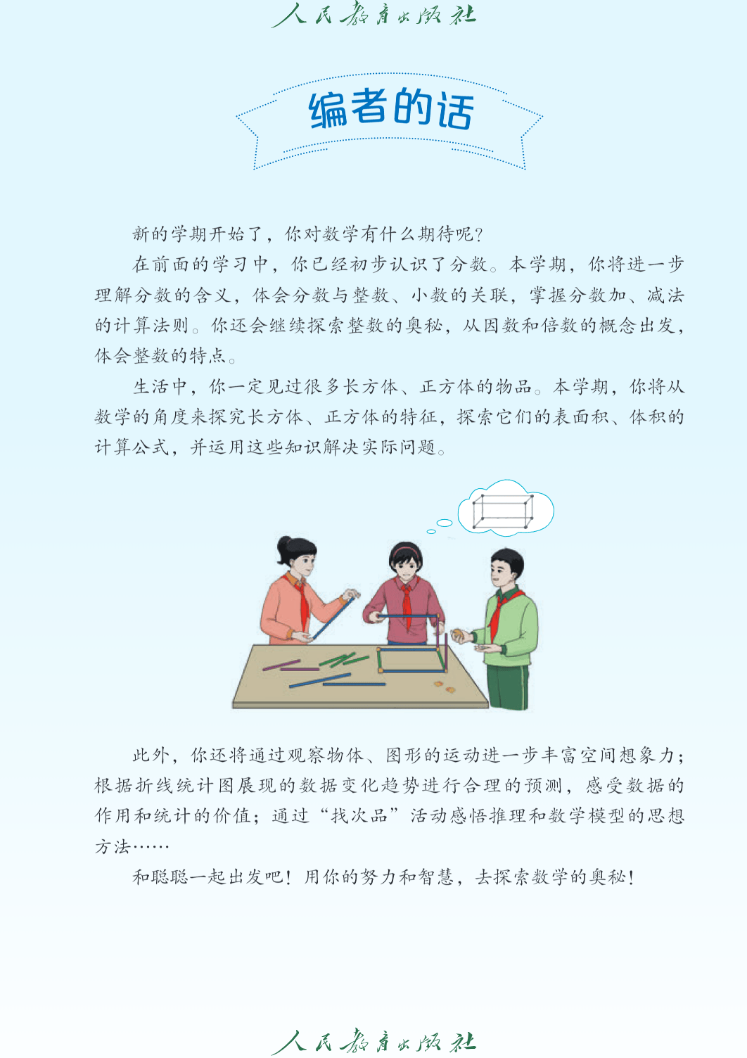 教材优化内容编排,新增观察物体单元,调整图形运动与统计板块,将关联知识集中呈现,契合学生认知规律。编写凸显实践性与探究性,通过生活情境导入(如立体图形实物观察)、动手操作实验(如长方体体积推导)、分层习题设计,强化知识与现实的联系。