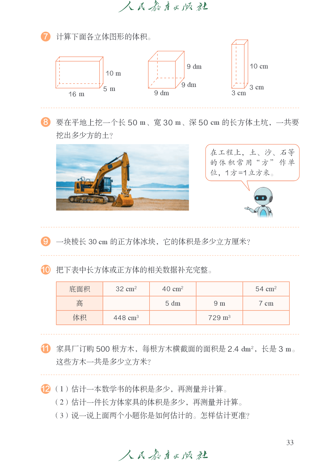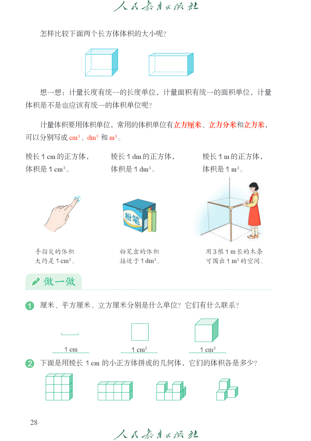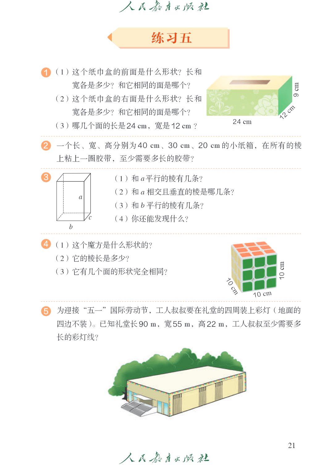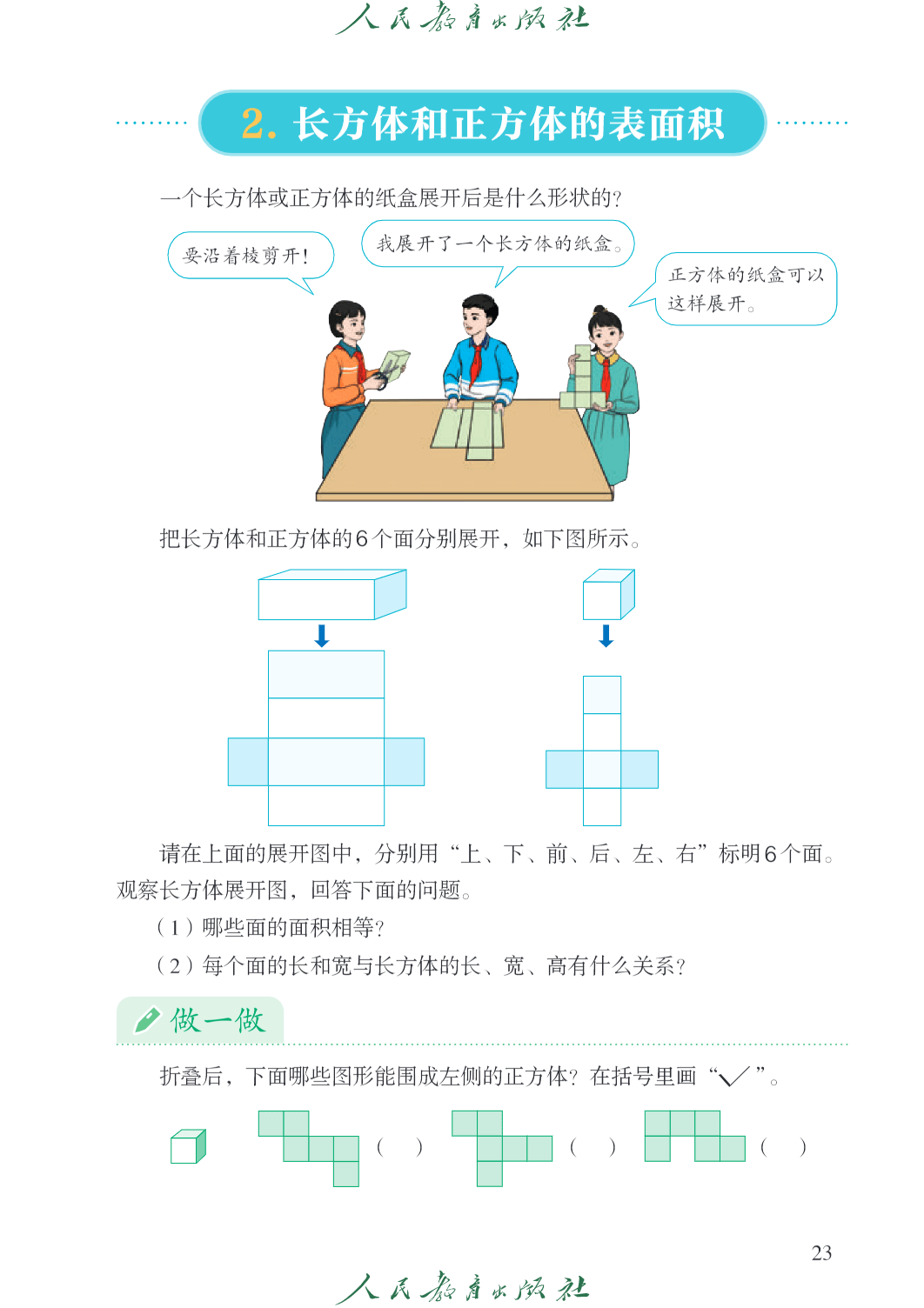 教材优化内容编排,新增观察物体单元,调整图形运动与统计板块,将关联知识集中呈现,契合学生认知规律。编写凸显实践性与探究性,通过生活情境导入(如立体图形实物观察)、动手操作实验(如长方体体积推导)、分层习题设计,强化知识与现实的联系。