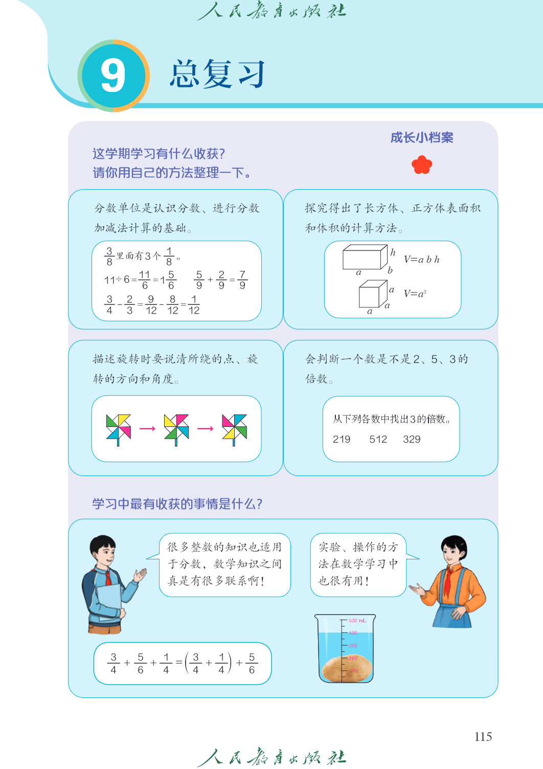 最新版人教版五年级数学下册是小学高段数学承上启下的关键教材,遵循“四基四能”培养要求,构建结构化知识体系,涵盖观察物体(三)、因数与倍数、长方体和正方体、分数的意义和性质、图形的运动(三)、分数的加法和减法、折线统计图、数学广角——找次品八大单元及“探索图形”“打电话”两项综合与实践活动。