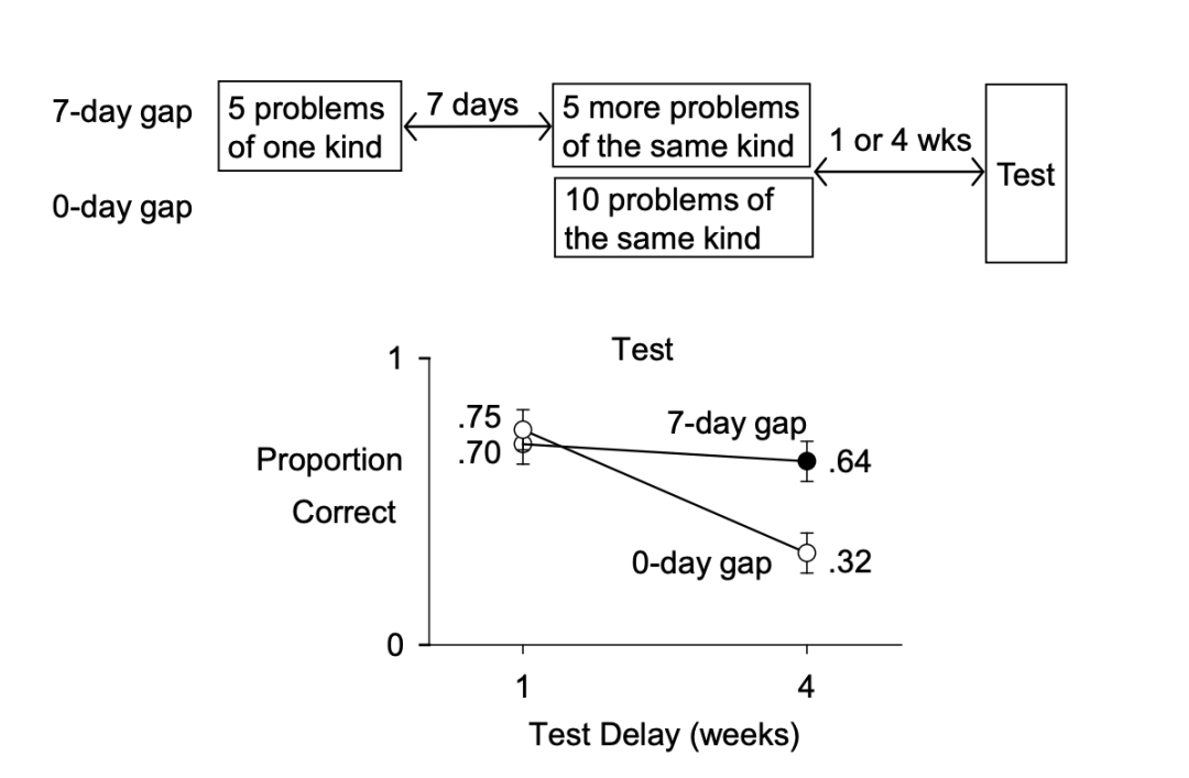 科学家让大学生们先观看了一段关于如何解决一种复杂排列问题的教程,然后在一次课中完成了 10 道练习题(0 天的间距间隔),或者将这些练习题分散在两个课次中完成,两个课次之间相隔一周(7 天的间距间隔)。