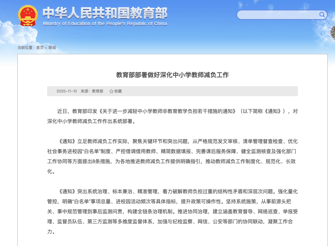 近日,教育部印发《关于进一步减轻中小学教师非教育教学负担若干措施的通知》(以下简称《通知》),对深化中小学教师减负工作作出系统部署。