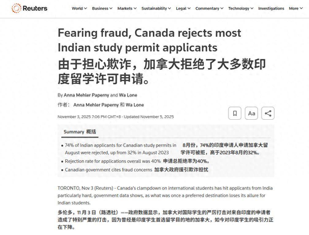印度留学生拒签率竟高达74%,是中国的3倍,全球平均的近两倍,“地主家也没有余粮了”加拿大留学政策突变,曾引以为傲的开放承诺,如今对印度学生已成一道高墙。