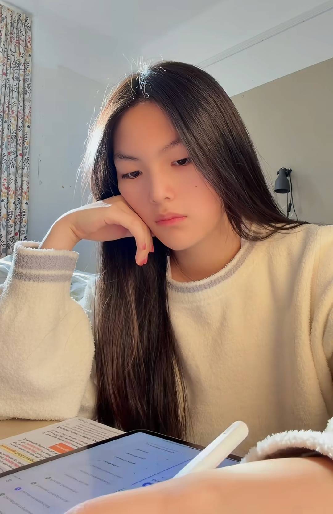 私下里的王诗龄依然保持着少女的清新感,没有像参加活动时那般成熟打扮。她穿着睡衣坐在桌前做作业,阳光透过窗户洒在她身上,显得既自然又美好。