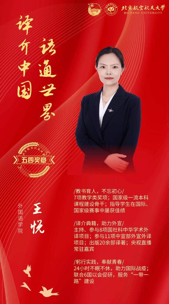 作为北航外国语学院青年骨干教师,王悦以“俄语+”跨域教学为核心抓手,深耕复合型外语人才培养,既打造特色鲜明的课堂教学模式,又在教学竞赛与实践育人中屡创佳绩。凭借突出的教学、科研与育人成果,王悦荣获第十八届“北航青年五四奖章”(2023年),成为连接语言教学、航天特色与国际交流的育人典范。