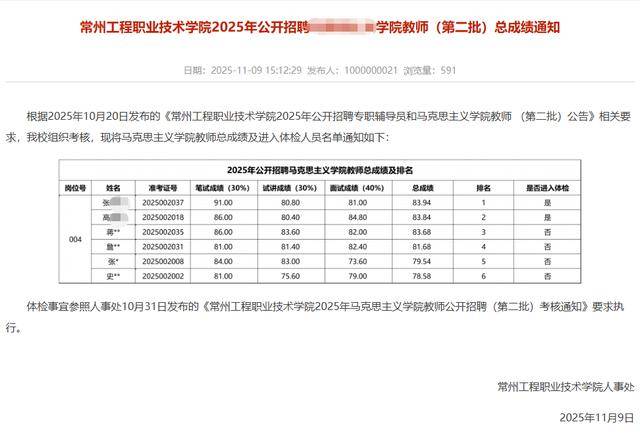 11月9日,有网友发帖称,在当日公布的常州工程职业技术学院2025年公开招聘一学院教师(第二批)总成绩中,最终进入体检阶段的张某某与高某某皆为该校教师。其中张某某还是校团委副书记、某学院副院长。11月10日,常州工程职业技术学院纪委办工作人员表示,张某某与高某某之前没有正式编制身份,但符合报考条件,通过了正常程序的考试,不存在“萝卜岗”问题。