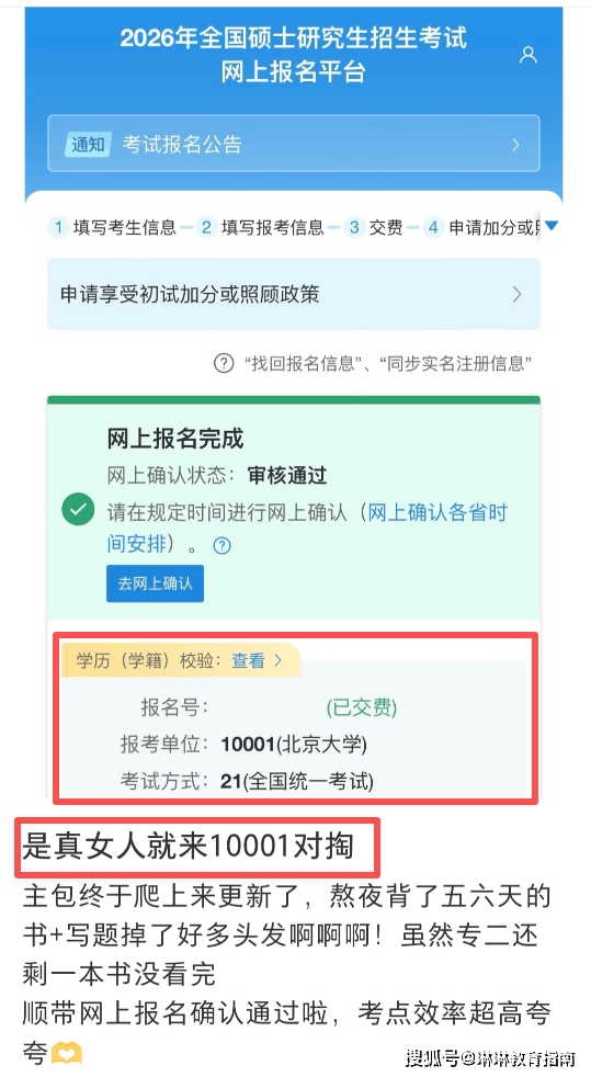 但无论大环境如何变化,都不缺乏有勇气的人,网上有名考研生晒出了自己的考研报名截图,配文也是非常霸气:“真女人就来10001对掏”,“对掏”这个词是近两年才火起来的网络用语。