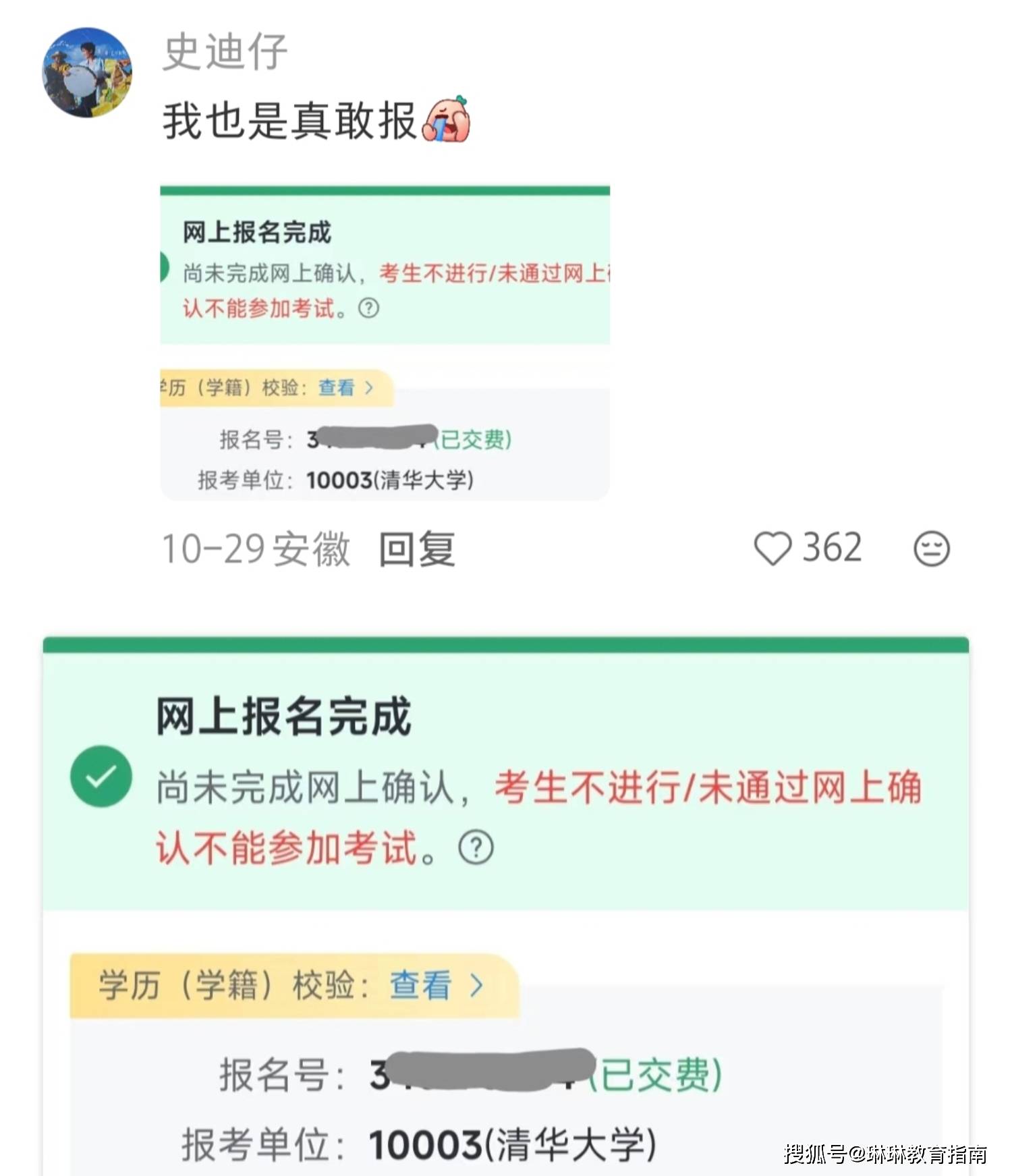 评论区也有不少人跟着晒出了自己的报名截图,有和女同学一样冲击10001北京大学的,也有选择10003清华大学的,总之勇气和实力都是不相上下,也有看热闹的学生好奇10002是哪所学校,查了一下是人大,也是当之无愧的优质名校。