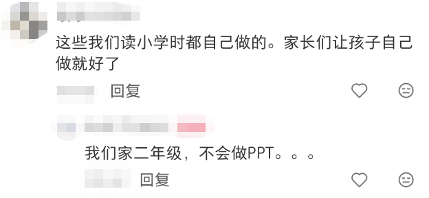还有家长表示,学校布置给孩子的任务靠孩子自己根本无法完成,于是许多老师布置给孩子的任务,自动变成了家长的任务。