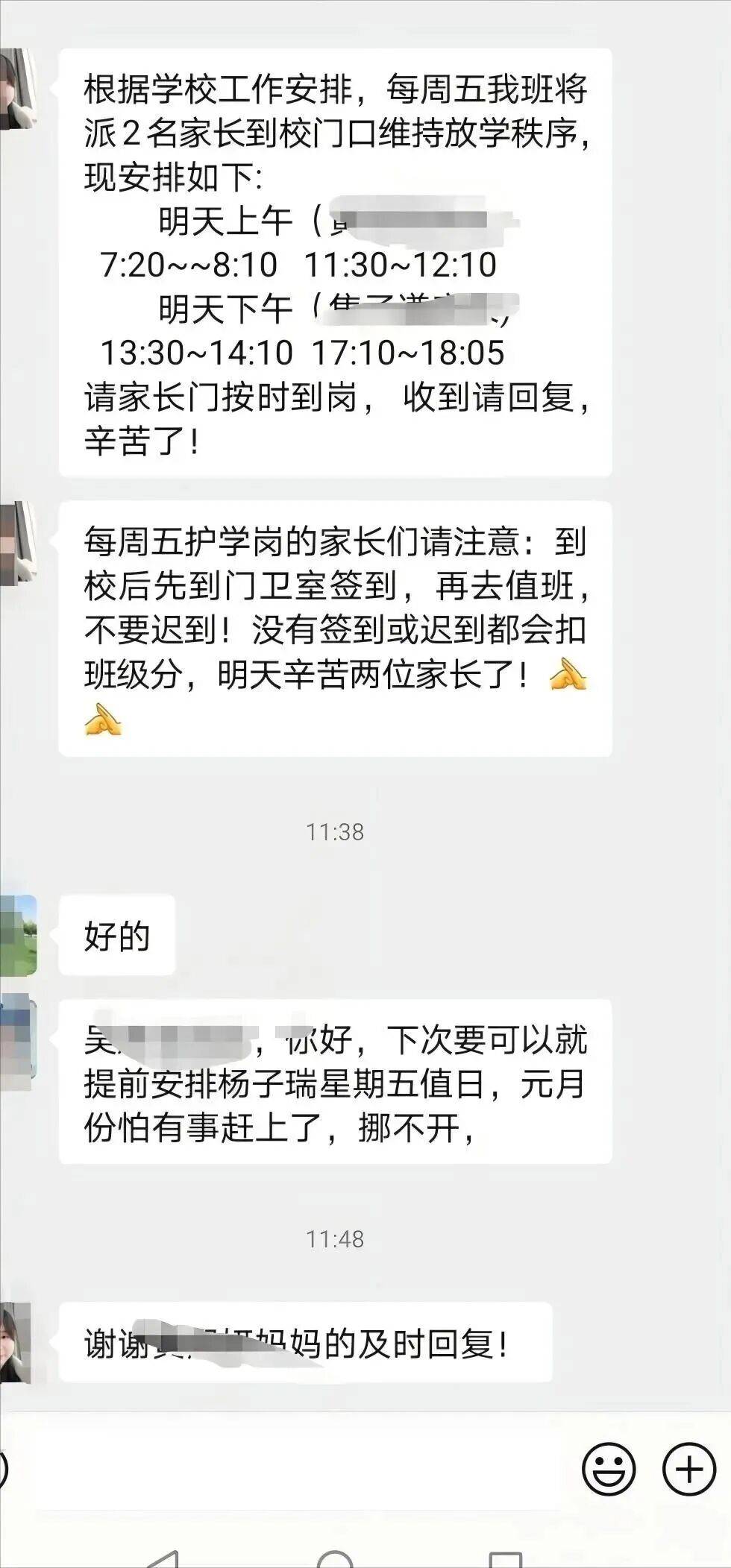 一位家长坦言,家委会通知护学岗排班表时,常常是“通知”而非“协商”。