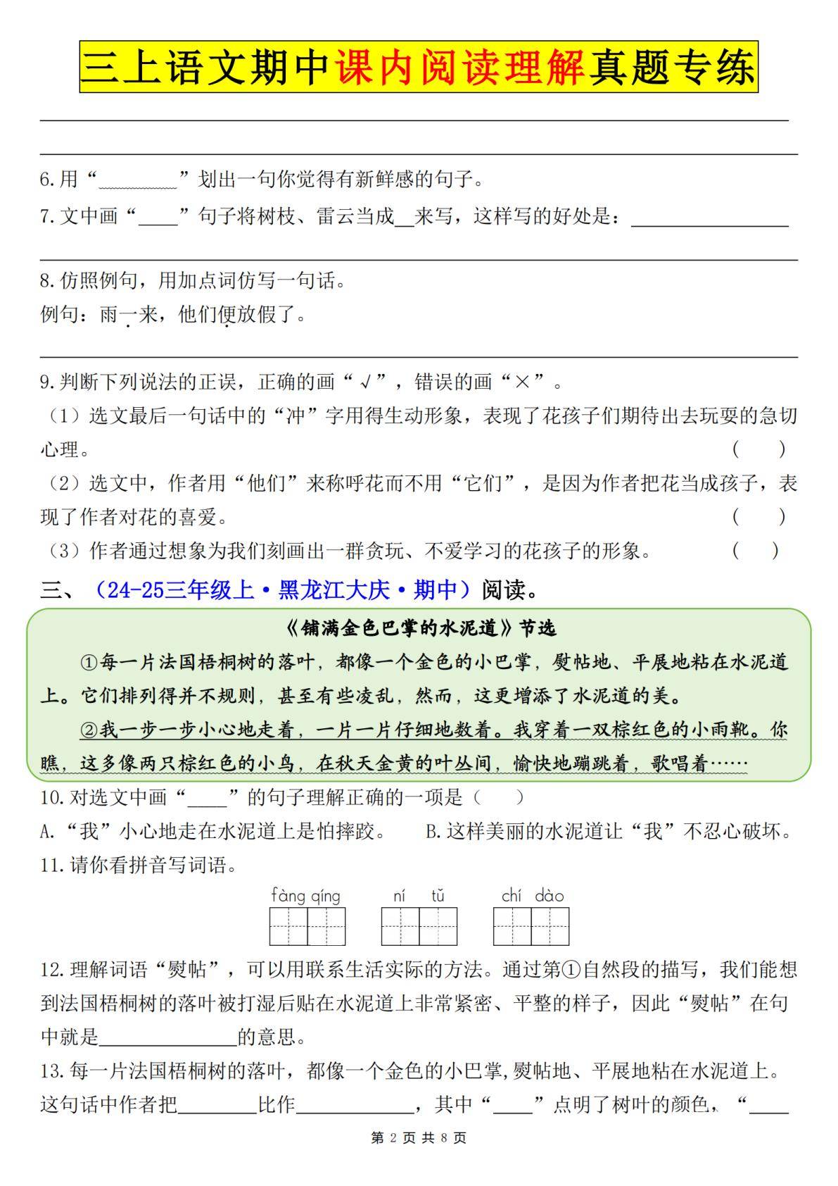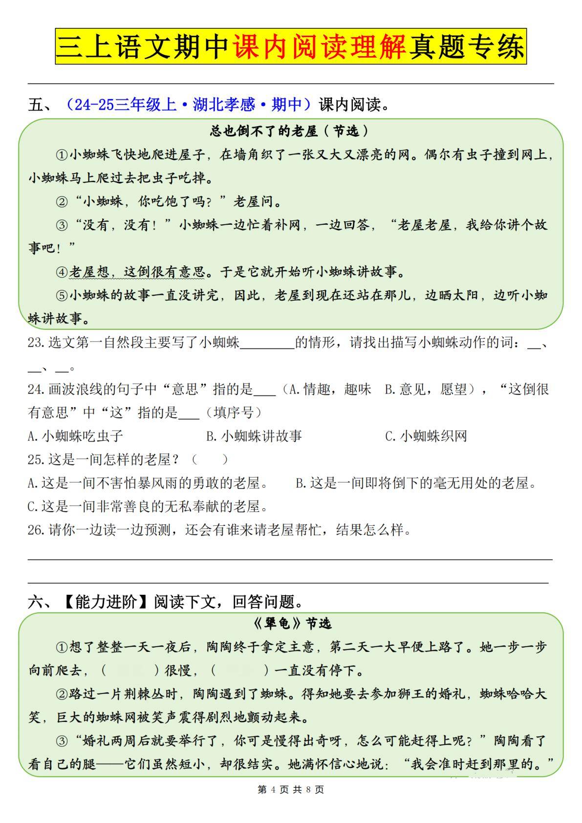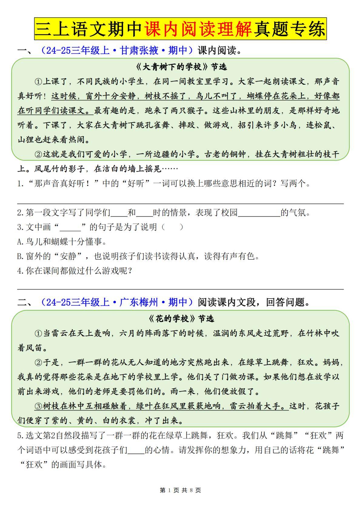 今天为大家分享:112【25年三上语文期中课内阅读理解真题专练(空白+答1案16页),是针对三年级上册学生语文课内阅读能力提升的专项训练素材。它涵盖了阅读知识考查、语文能力培养、学科素养提升等多个方面,对学生的语文学习有着多维度的助力。