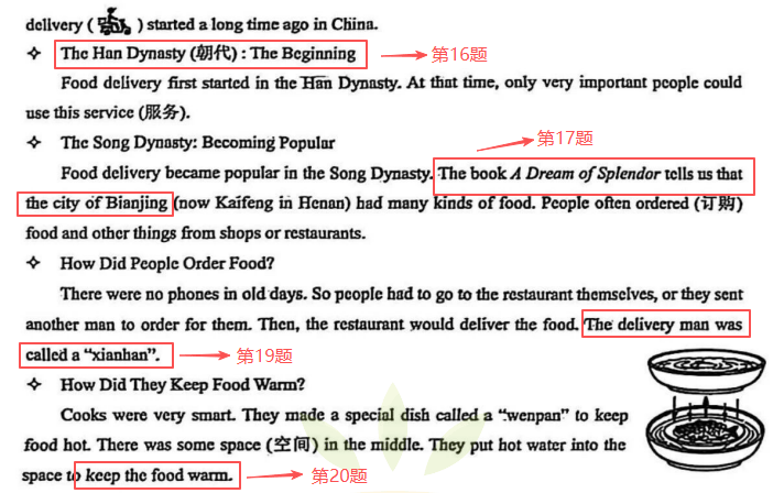 • 核心考点:历史类短文理解,考查“细节查找+信息匹配”能力,主题为“中国古代外卖”。