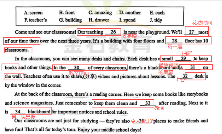◦ 35题:(amazing)classrooms(令人惊讶的,选C)