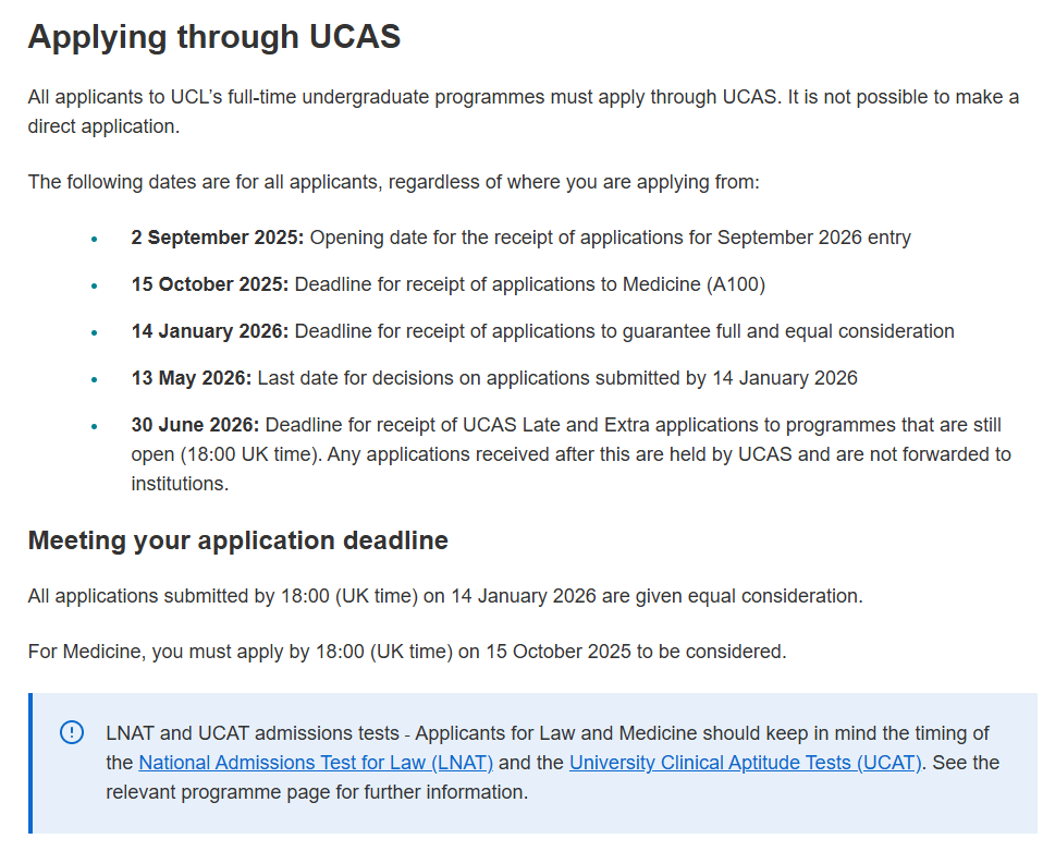 2026年6月30日 18:00(英国时间):“Extra”和“Late”申请截止。此日期后,UCAS将不再向UCL转发新的申请。